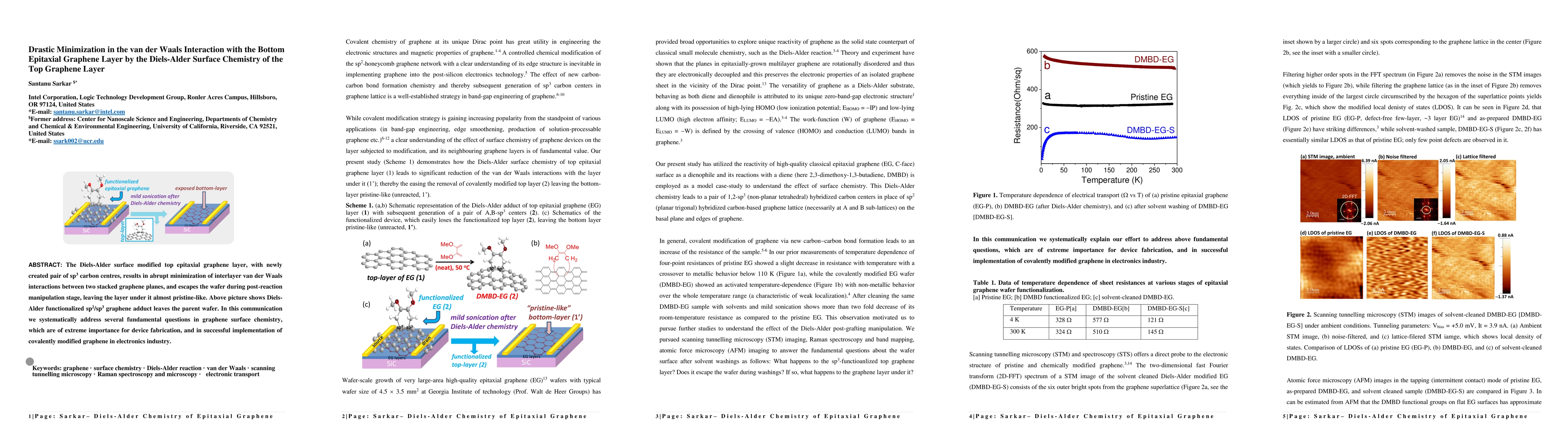The Diels-Alder surface modified top epitaxial graphene layer, with newly created pair of sp3 carbon centres, results in abrupt minimization of interlayer van der Waals interactions between two stacked graphene planes, and escapes the wafer during post-reaction manipulation stage, leaving the layer under it almost pristine-like. Above picture shows Diels-Alder functionalized sp2/sp3 graphene adduct leaves the parent wafer. In this communication we systematically address several fundamental questions in graphene surface chemistry, which are of extreme importance for device fabrication, and in successful implementation of covalently modified graphene in electronics industry.