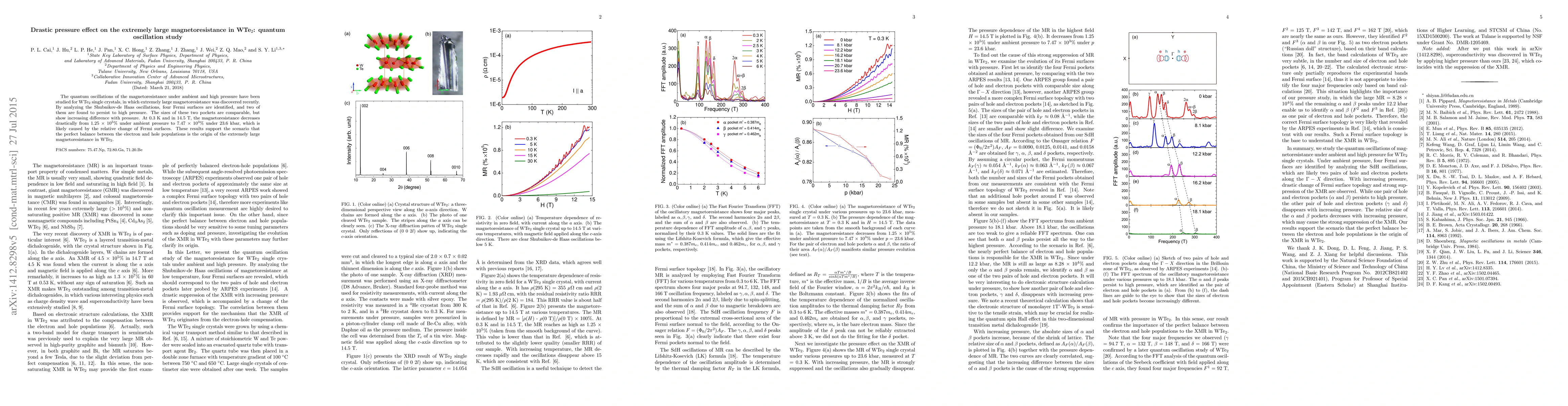 This research investigates WTe2's quantum oscillations under ambient and high pressure, revealing four Fermi surfaces. The study finds that two Fermi pockets persist under pressure, and their size difference increases, linked to a drastic decrease in magnetoresistance from $1.25 imes 10^5%$ to $7.47 imes 10^3%$ under pressure. This supports the hypothesis that balanced electron and hole populations cause WTe2's extremely large magnetoresistance.