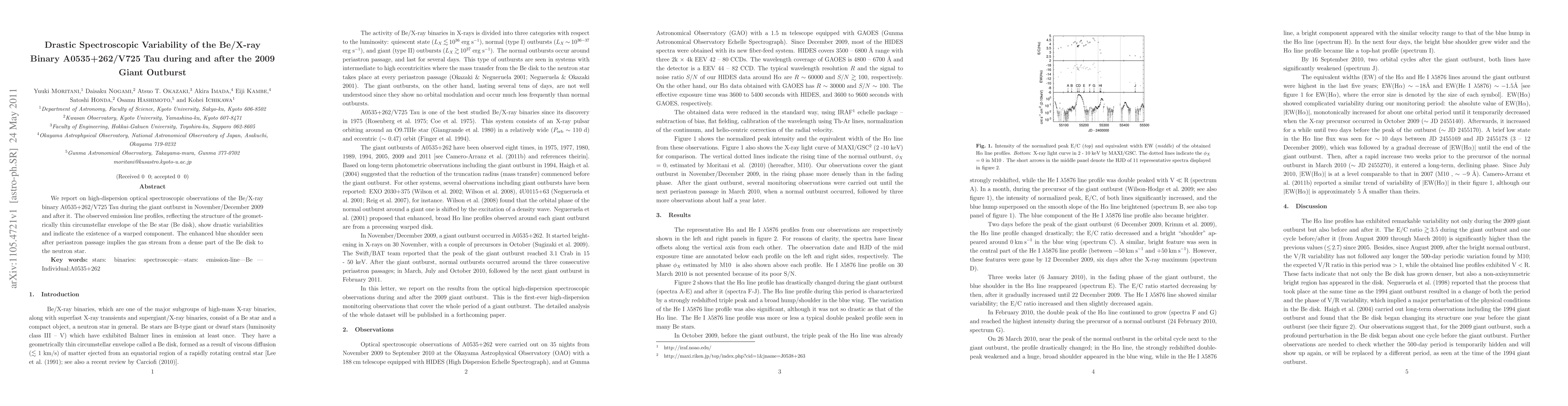 This study documents significant spectroscopic changes in the Be/X-ray binary A0535+262/V725 Tau during and post its 2009 giant outburst, revealing a warped circumstellar envelope and a dense gas stream from the Be disk to the neutron star.