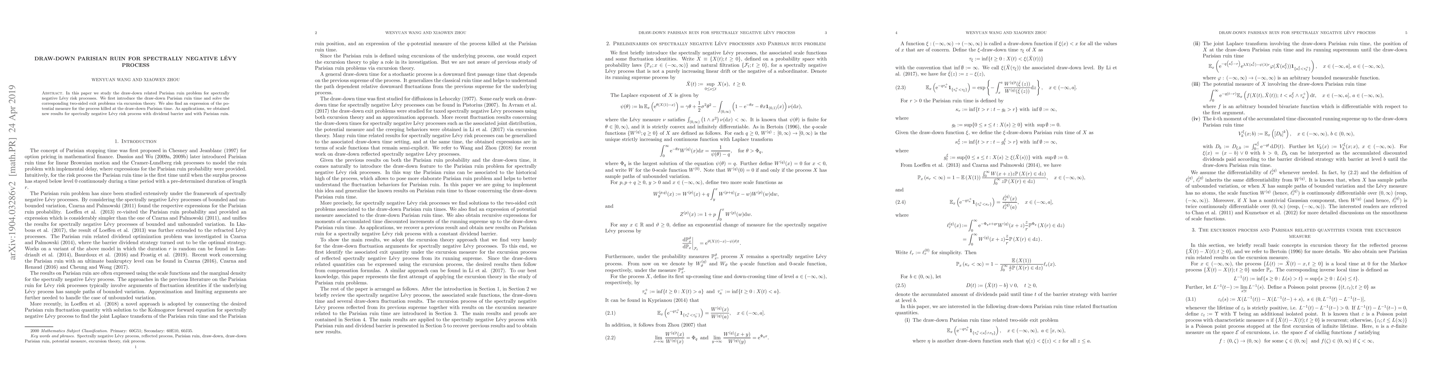 This paper investigates the draw-down Parisian ruin problem for spectrally negative Lévy risk processes, introducing the draw-down Parisian ruin time and solving the associated two-sided exit time using excursion theory. It also provides an expression for the potential measure for the process terminated at the draw-down Parisian time, with applications to spectrally negative Lévy risk processes with dividend barriers and Parisian ruin.