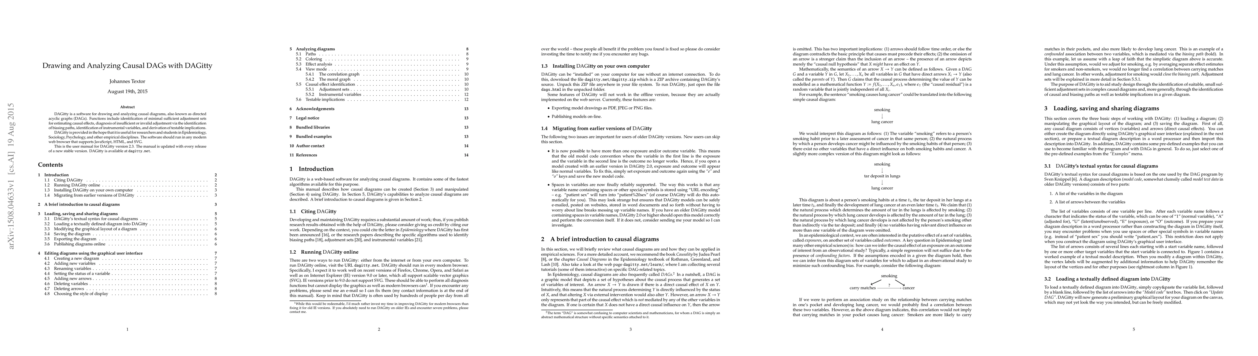 DAGitty is a software for drawing and analyzing causal diagrams, also known as directed acyclic graphs (DAGs). Functions include identification of minimal sufficient adjustment sets for estimating causal effects, diagnosis of insufficient or invalid adjustment via the identification of biasing paths, identification of instrumental variables, and derivation of testable implications. DAGitty is provided in the hope that it is useful for researchers and students in Epidemiology, Sociology, Psychology, and other empirical disciplines. The software should run in any web browser that supports modern JavaScript, HTML, and SVG. This is the user manual for DAGitty version 2.3. The manual is updated with every release of a new stable version. DAGitty is available at dagitty.net.