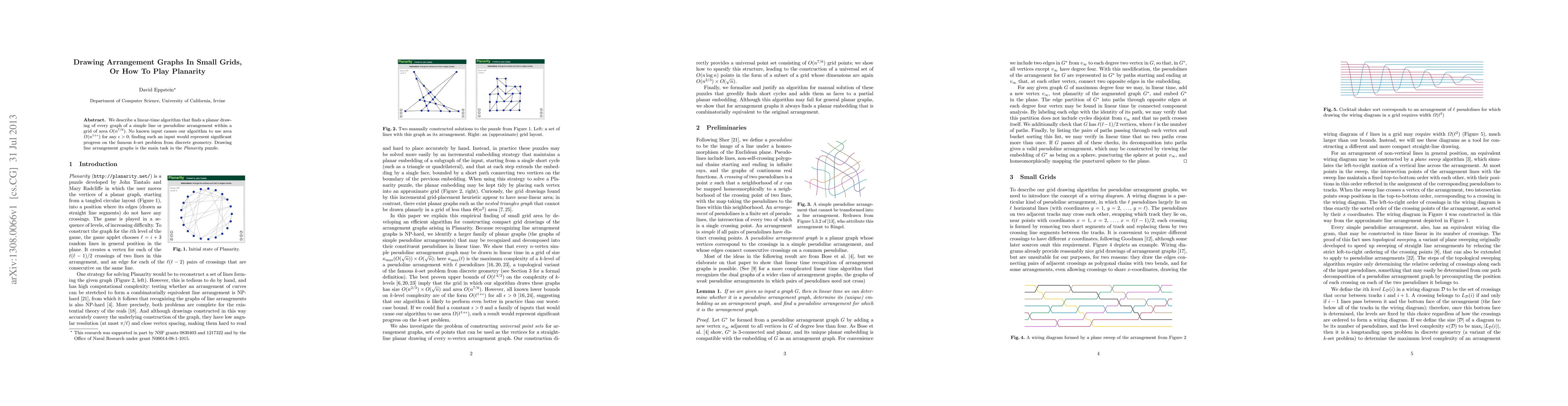 We describe a linear-time algorithm that finds a planar drawing of every graph of a simple line or pseudoline arrangement within a grid of area O(n^{7/6}). No known input causes our algorithm to use area \Omega(n^{1+\epsilon}) for any \epsilon>0; finding such an input would represent significant progress on the famous k-set problem from discrete geometry. Drawing line arrangement graphs is the main task in the Planarity puzzle.