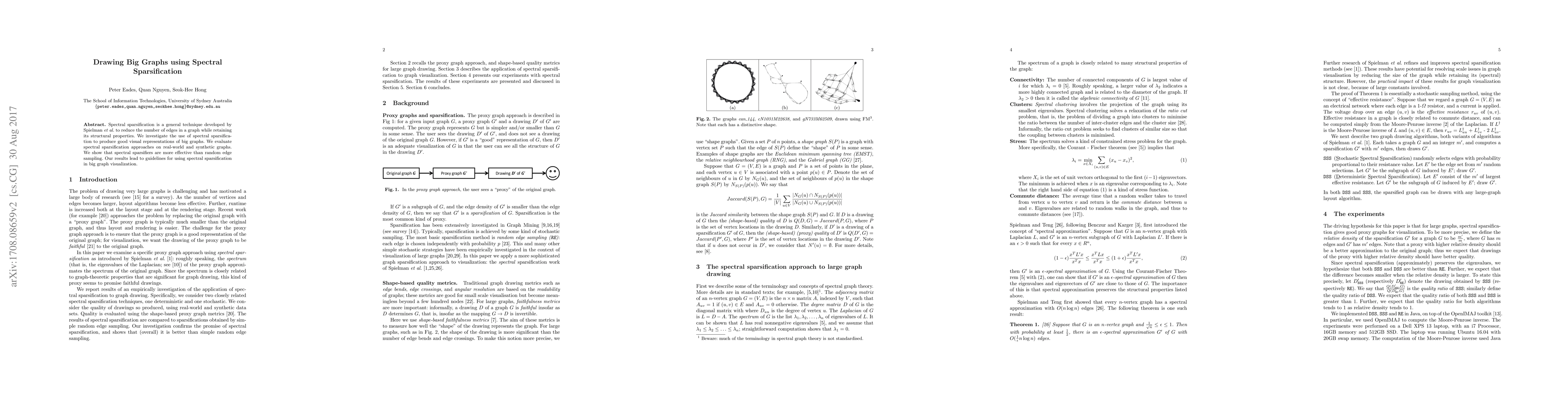 This paper explores spectral sparsification to create effective visual representations of large graphs, demonstrating its superiority over random edge sampling through evaluations on both real-world and synthetic data, and provides guidelines for its application in big graph visualization.