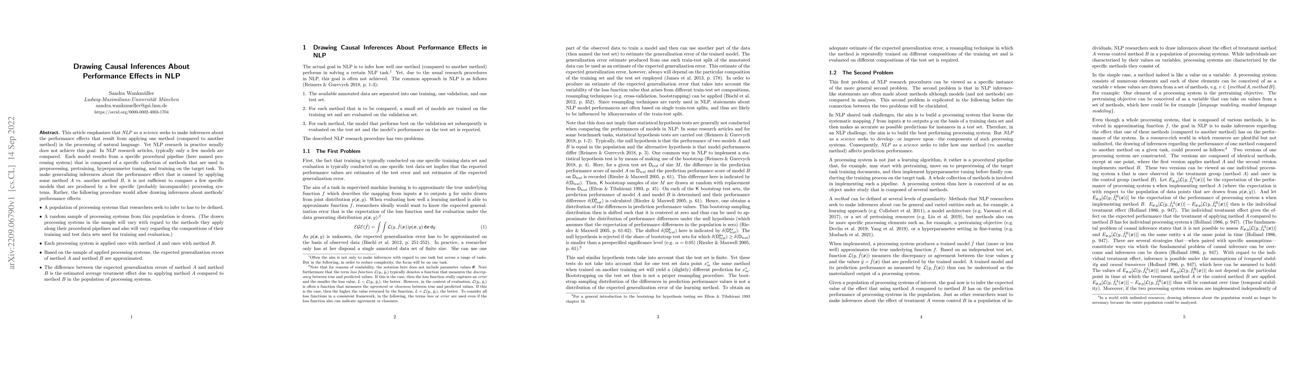 This article emphasizes that NLP as a science seeks to make inferences about the performance effects that result from applying one method (compared to another method) in the processing of natural language. Yet NLP research in practice usually does not achieve this goal: In NLP research articles, typically only a few models are compared. Each model results from a specific procedural pipeline (here named processing system) that is composed of a specific collection of methods that are used in preprocessing, pretraining, hyperparameter tuning, and training on the target task. To make generalizing inferences about the performance effect that is caused by applying some method A vs. another method B, it is not sufficient to compare a few specific models that are produced by a few specific (probably incomparable) processing systems. Rather, the following procedure would allow drawing inferences about methods' performance effects: (1) A population of processing systems that researchers seek to infer to has to be defined. (2) A random sample of processing systems from this population is drawn. (The drawn processing systems in the sample will vary with regard to the methods they apply along their procedural pipelines and also will vary regarding the compositions of their training and test data sets used for training and evaluation.) (3) Each processing system is applied once with method A and once with method B. (4) Based on the sample of applied processing systems, the expected generalization errors of method A and method B are approximated. (5) The difference between the expected generalization errors of method A and method B is the estimated average treatment effect due to applying method A compared to method B in the population of processing systems.