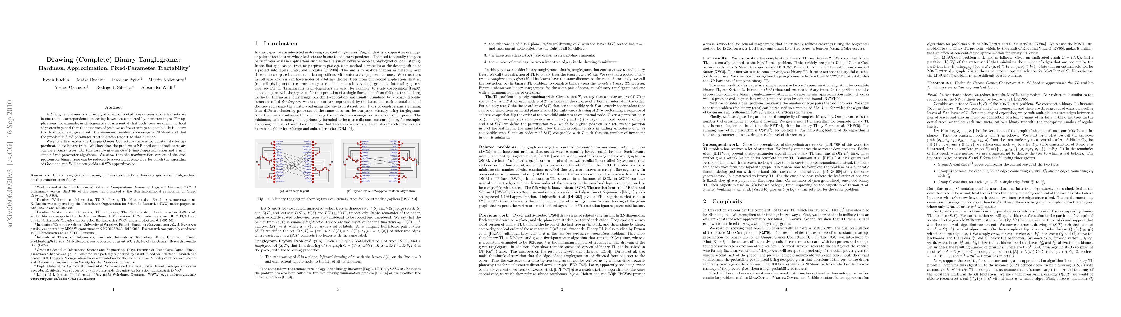 Researchers show that drawing binary tanglegrams with minimal edge crossings is NP-hard, but provide a 2-approximation algorithm for complete trees and connections to MaxCut.