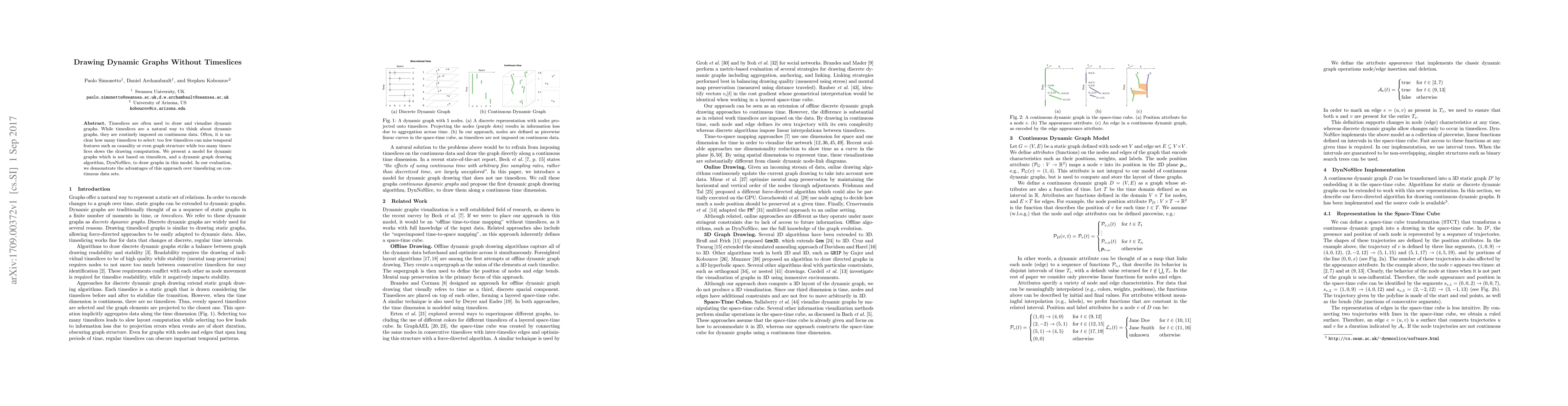 This paper proposes a novel model for dynamic graphs that avoids the use of timeslices, introducing a new algorithm, DynNoSlice, for drawing these graphs. The evaluation shows that this approach better captures temporal features and improves computational efficiency compared to traditional timeslice-based methods.