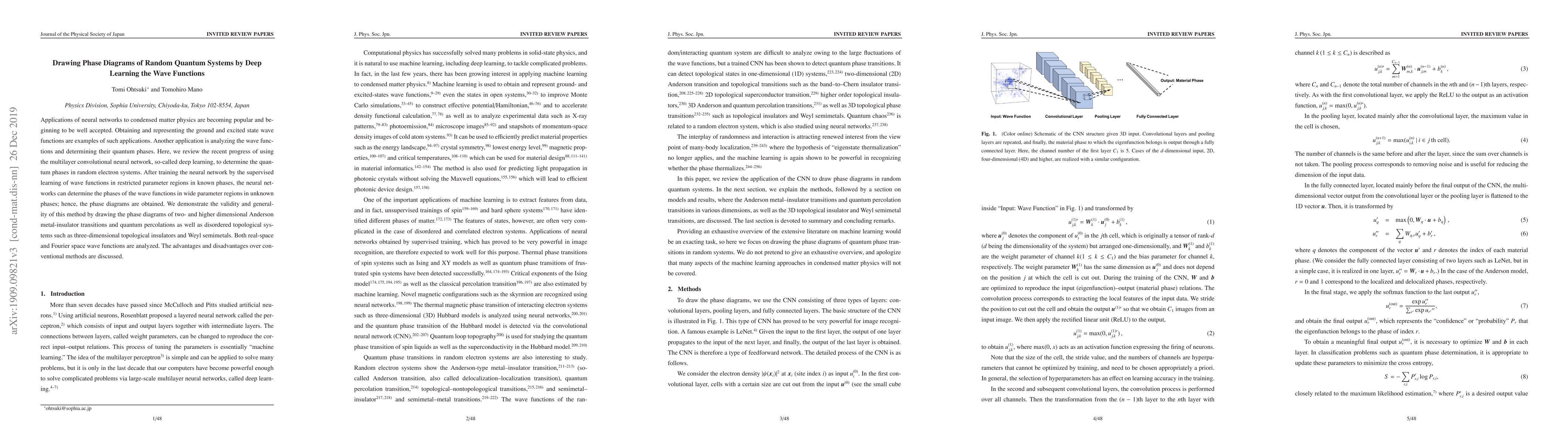 Applications of neural networks to condensed matter physics are becoming popular and beginning to be well accepted. Obtaining and representing the ground and excited state wave functions are examples of such applications. Another application is analyzing the wave functions and determining their quantum phases. Here, we review the recent progress of using the multilayer convolutional neural network, so-called deep learning, to determine the quantum phases in random electron systems. After training the neural network by the supervised learning of wave functions in restricted parameter regions in known phases, the neural networks can determine the phases of the wave functions in wide parameter regions in unknown phases; hence, the phase diagrams are obtained. We demonstrate the validity and generality of this method by drawing the phase diagrams of two- and higher dimensional Anderson metal-insulator transitions and quantum percolations as well as disordered topological systems such as three-dimensional topological insulators and Weyl semimetals. Both real-space and Fourier space wave functions are analyzed. The advantages and disadvantages over conventional methods are discussed.