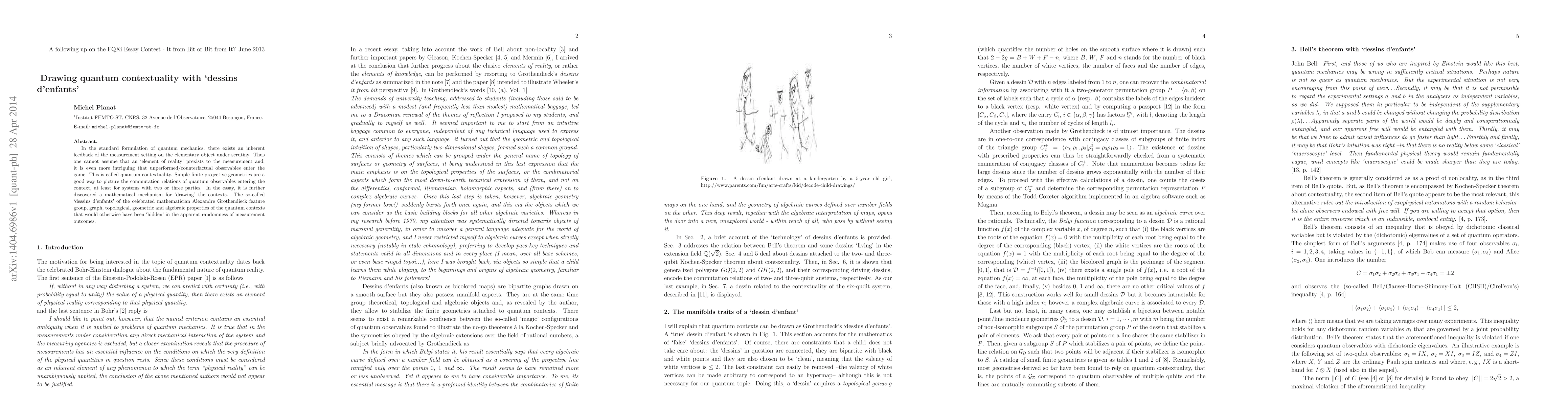 In the standard formulation of quantum mechanics, there exists an inherent feedback of the measurement setting on the elementary object under scrutiny. Thus one cannot assume that an 'element of reality' prexists to the measurement and, it is even more intriguing that unperformed/counterfactual observables enter the game. This is called quantum contextuality. Simple finite projective geometries are a good way to picture the commutation relations of quantum observables entering the context, at least for systems with two or three parties. In the essay, it is further discovered a mathematical mechanism for 'drawing' the contexts. The so-called 'dessins d'enfants' of the celebrated mathematician Alexandre Grothendieck feature group, graph, topological, geometric and algebraic properties of the quantum contexts that would otherwise have been 'hidden' in the apparent randomness of measurement outcomes.