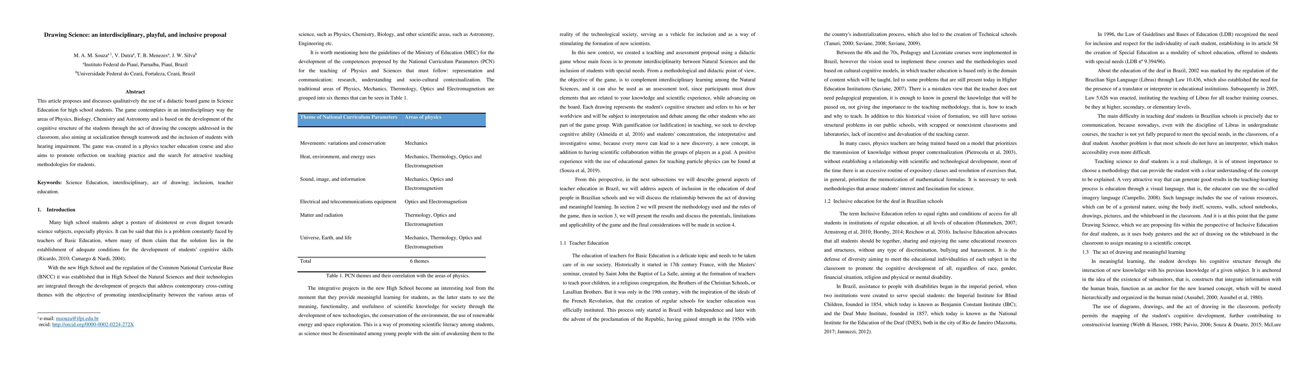 This article proposes a didactic board game integrating Physics, Biology, Chemistry, and Astronomy to enhance high school science education through drawing and teamwork, aiming to foster cognitive development and inclusivity for students with hearing impairments. The game was developed in a physics teacher education course to encourage reflection on teaching methods.