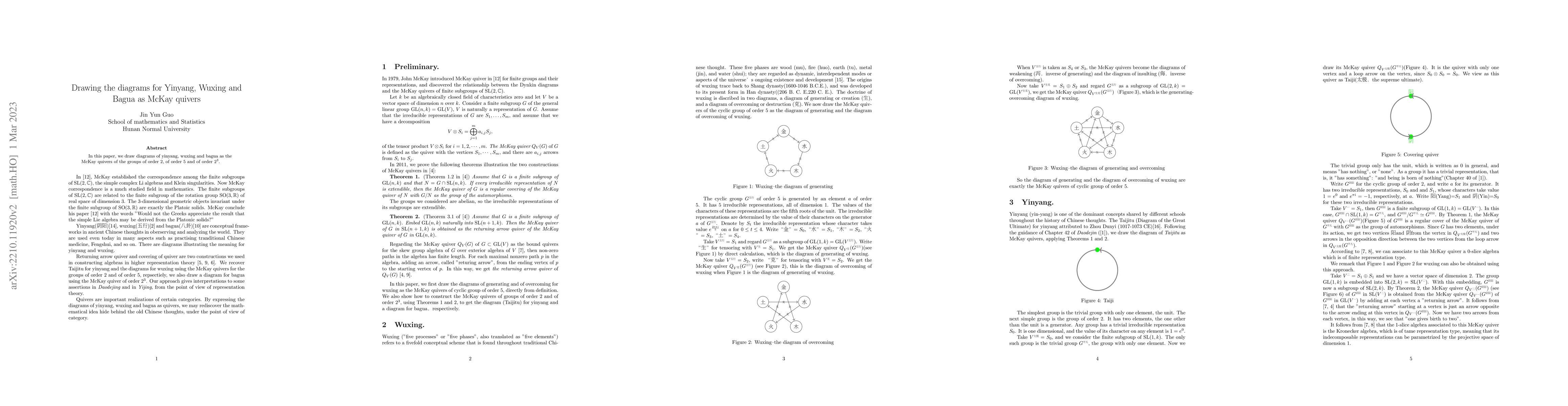 Summary: This paper illustrates the yinyang, wuxing, and bagua concepts using McKay quivers corresponding to groups of order 2, 5, and 8, respectively. The diagrams provide a modern mathematical framework for understanding these traditional Chinese symbols.