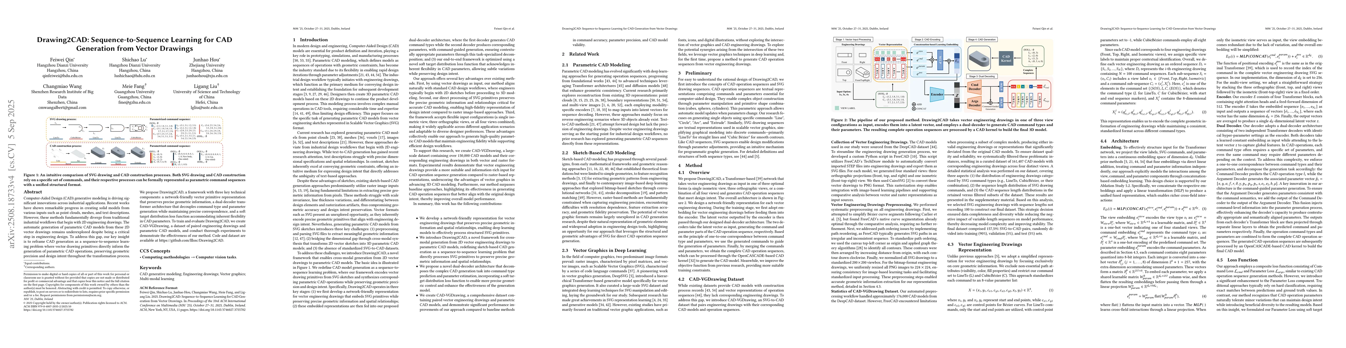 Computer-Aided Design (CAD) generative modeling is driving significant innovations across industrial applications. Recent works have shown remarkable progress in creating solid models from various inputs such as point clouds, meshes, and text descriptions. However, these methods fundamentally diverge from traditional industrial workflows that begin with 2D engineering drawings. The automatic generation of parametric CAD models from these 2D vector drawings remains underexplored despite being a critical step in engineering design. To address this gap, our key insight is to reframe CAD generation as a sequence-to-sequence learning problem where vector drawing primitives directly inform the generation of parametric CAD operations, preserving geometric precision and design intent throughout the transformation process. We propose Drawing2CAD, a framework with three key technical components: a network-friendly vector primitive representation that preserves precise geometric information, a dual-decoder transformer architecture that decouples command type and parameter generation while maintaining precise correspondence, and a soft target distribution loss function accommodating inherent flexibility in CAD parameters. To train and evaluate Drawing2CAD, we create CAD-VGDrawing, a dataset of paired engineering drawings and parametric CAD models, and conduct thorough experiments to demonstrate the effectiveness of our method. Code and dataset are available at https://github.com/lllssc/Drawing2CAD.
