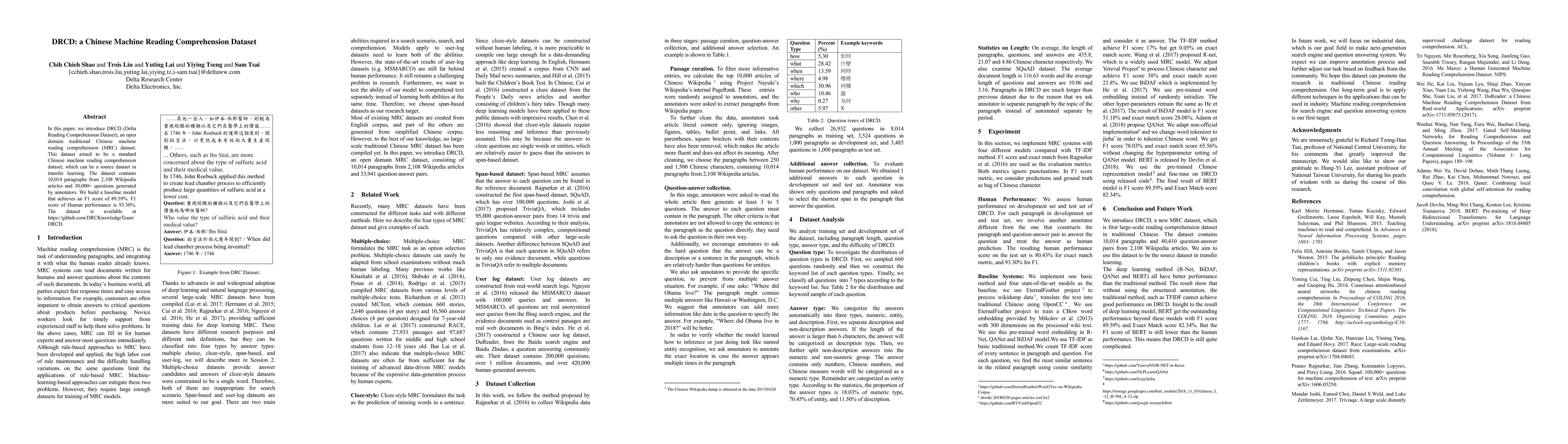 Summary: The DRCD dataset is an open-domain Chinese machine reading comprehension dataset derived from Wikipedia, consisting of 10,014 paragraphs and over 30,000 questions. A baseline model achieves an F1 score of 89.59%, while human performance reaches 93.30%.
