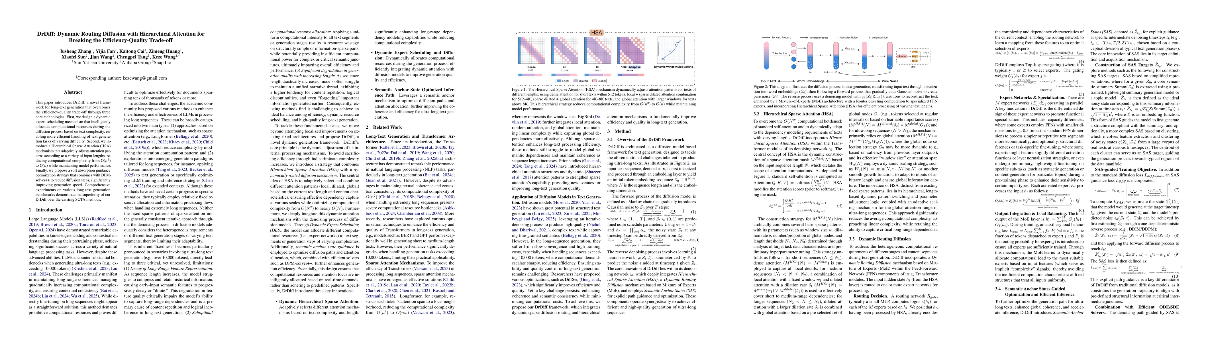 This paper introduces DrDiff, a novel framework for long-text generation that overcomes the efficiency-quality trade-off through three core technologies. First, we design a dynamic expert scheduling mechanism that intelligently allocates computational resources during the diffusion process based on text complexity, enabling more efficient handling of text generation tasks of varying difficulty. Second, we introduce a Hierarchical Sparse Attention (HSA) mechanism that adaptively adjusts attention patterns according to a variety of input lengths, reducing computational complexity from O($n^2$) to O($n$) while maintaining model performance. Finally, we propose a soft absorption guidance optimization strategy that combines with DPM-solver++ to reduce diffusion steps, significantly improving generation speed. Comprehensive experiments on various long-text generation benchmarks demonstrate the superiority of our DrDiff over the existing SOTA methods.