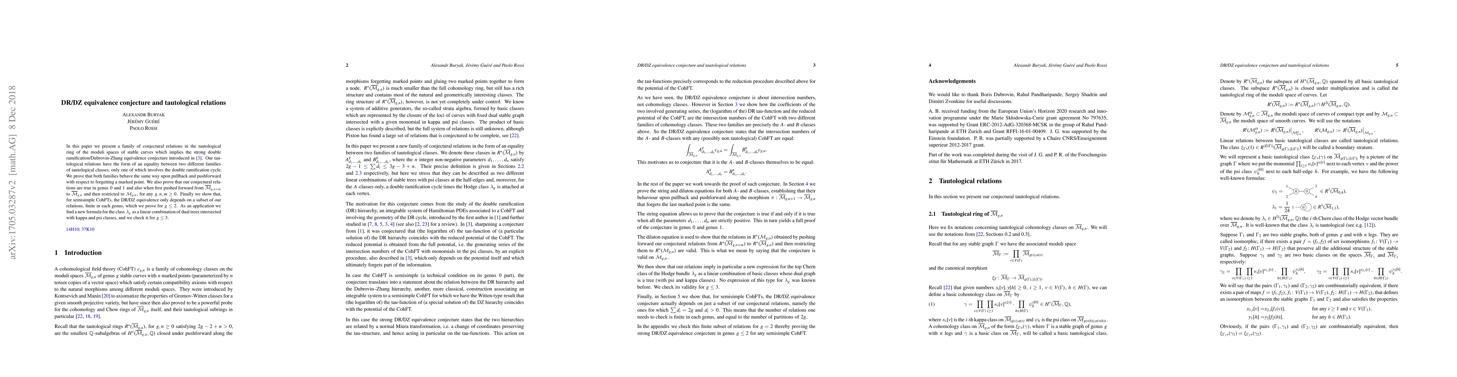In this paper we present a family of conjectural relations in the tautological ring of the moduli spaces of stable curves which implies the strong double ramification/Dubrovin-Zhang equivalence conjecture. Our tautological relations have the form of an equality between two different families of tautological classes, only one of which involves the double ramification cycle. We prove that both families behave the same way upon pullback and pushforward with respect to forgetting a marked point. We also prove that our conjectural relations are true in genus $0$ and $1$ and also when first pushed forward from $\overline{\mathcal{M}}_{g,n+m}$ to $\overline{\mathcal{M}}_{g,n}$ and then restricted to $\mathcal{M}_{g,n}$, for any $g,n,m\geq 0$. Finally we show that, for semisimple CohFTs, the DR/DZ equivalence only depends on a subset of our relations, finite in each genus, which we prove for $g\leq 2$. As an application we find a new formula for the class $\lambda_g$ as a linear combination of dual trees intersected with kappa and psi classes, and we check it for $g \leq 3$.