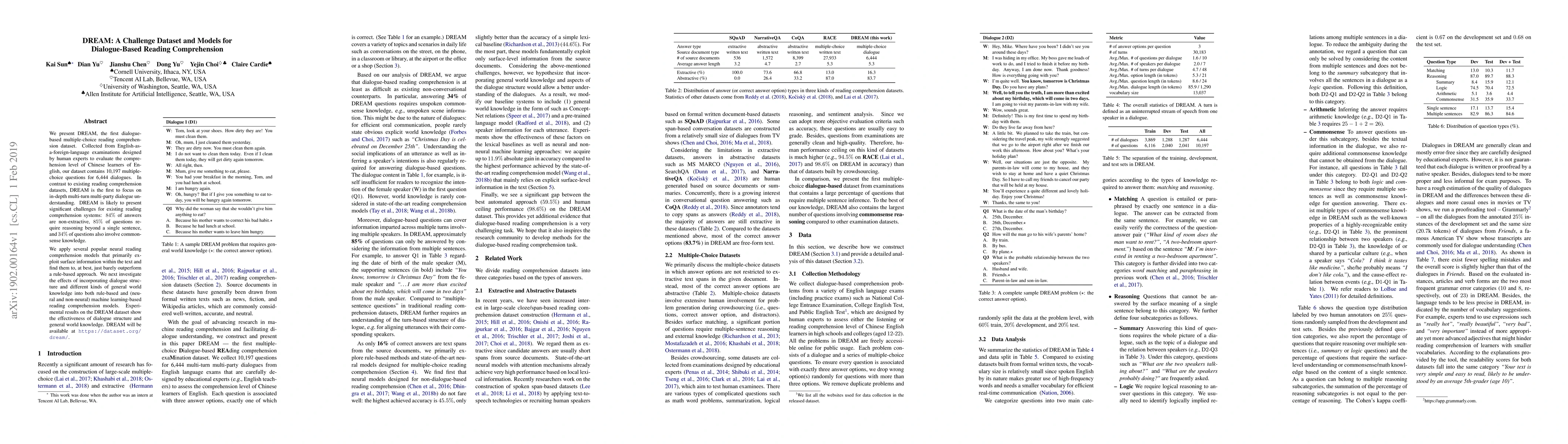 We present DREAM, the first dialogue-based multiple-choice reading comprehension dataset. Collected from English-as-a-foreign-language examinations designed by human experts to evaluate the comprehension level of Chinese learners of English, our dataset contains 10,197 multiple-choice questions for 6,444 dialogues. In contrast to existing reading comprehension datasets, DREAM is the first to focus on in-depth multi-turn multi-party dialogue understanding. DREAM is likely to present significant challenges for existing reading comprehension systems: 84% of answers are non-extractive, 85% of questions require reasoning beyond a single sentence, and 34% of questions also involve commonsense knowledge. We apply several popular neural reading comprehension models that primarily exploit surface information within the text and find them to, at best, just barely outperform a rule-based approach. We next investigate the effects of incorporating dialogue structure and different kinds of general world knowledge into both rule-based and (neural and non-neural) machine learning-based reading comprehension models. Experimental results on the DREAM dataset show the effectiveness of dialogue structure and general world knowledge. DREAM will be available at https://dataset.org/dream/.