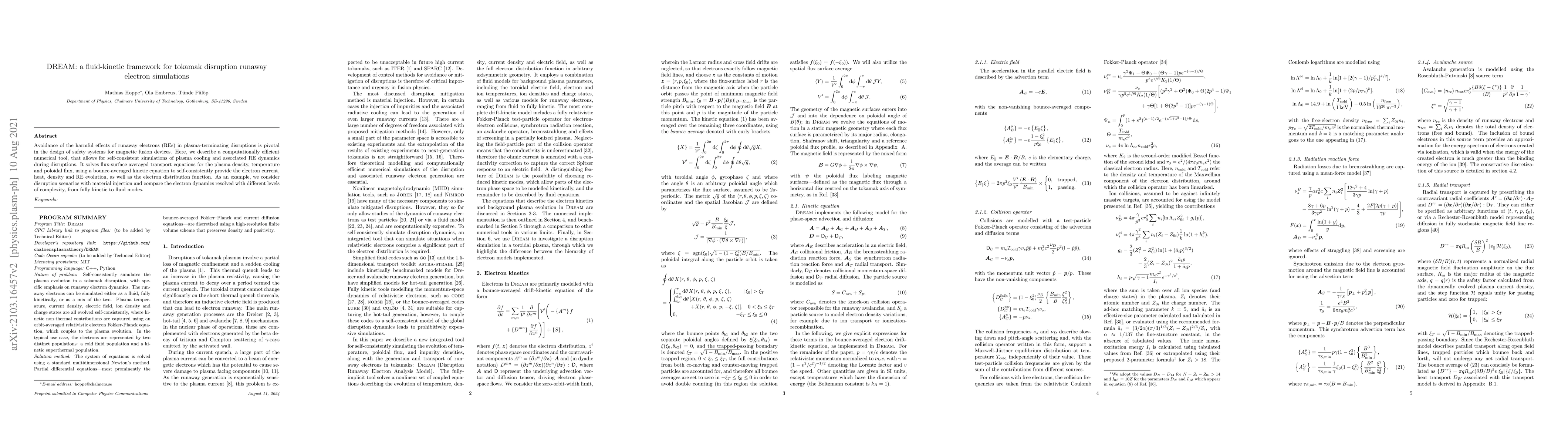 This paper introduces DREAM, a computational framework for simulating runaway electron dynamics during tokamak disruptions. It efficiently models plasma cooling and self-consistently tracks electron current, heat, and runaway electron evolution using a fluid-kinetic approach. The study compares disruption scenarios with material injection, illustrating the framework's capability to resolve electron dynamics across different complexity levels.