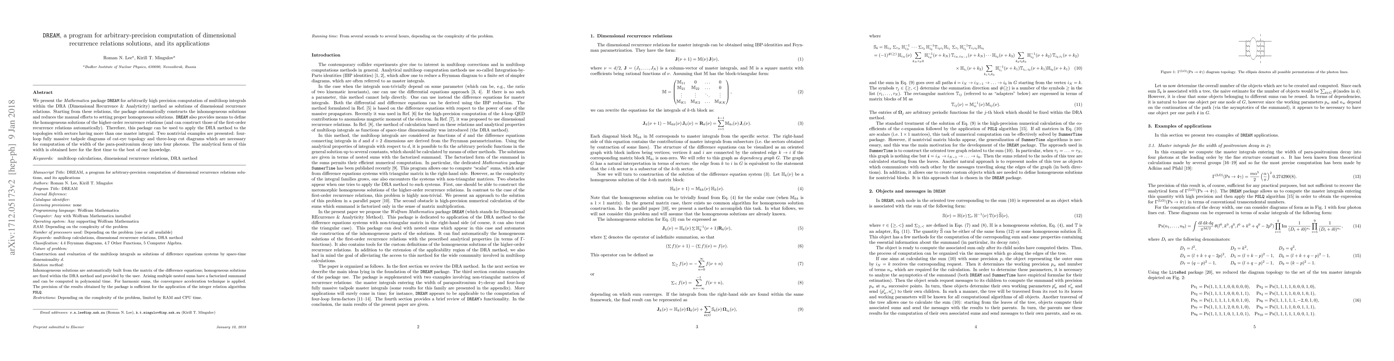 We present the Mathematica package DREAM for arbitrarily high precision computation of multiloop integrals within the DRA (Dimensional Recurrence & Analyticity) method as solutions of dimensional recurrence relations. Starting from these relations, the package automatically constructs the inhomogeneous solutions and reduces the manual efforts to setting proper homogeneous solutions. DREAM also provides means to define the homogeneous solutions of the higher-order recurrence relations (and can construct those of the first-order recurrence relations automatically). Therefore, this package can be used to apply the DRA method to the topologies with sectors having more than one master integral. Two nontrivial examples are presented: four-loop fully massive tadpole diagrams of cat-eye topology and three-loop cut diagrams which are necessary for computation of the width of the para-positronium decay into four photons. The analytical form of this width is obtained here for the first time to the best of our knowledge.