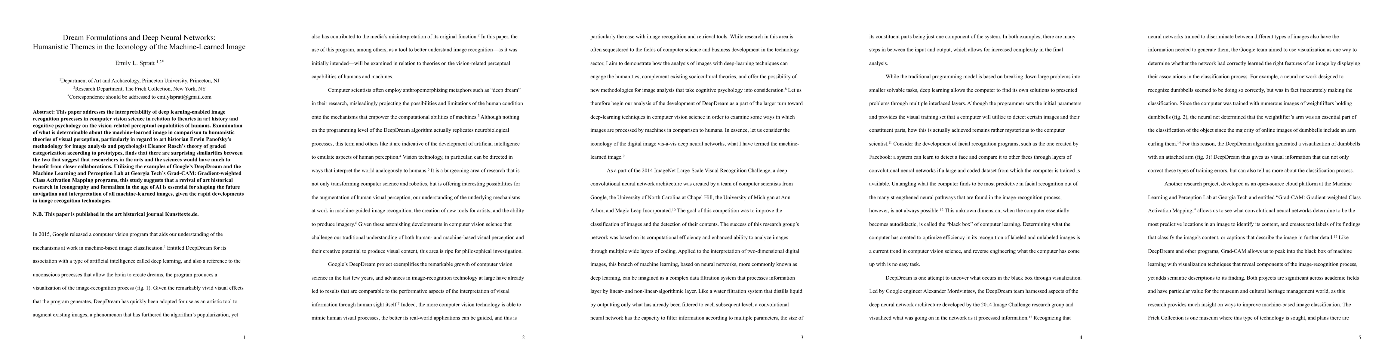 This paper addresses the interpretability of deep learning-enabled image recognition processes in computer vision science in relation to theories in art history and cognitive psychology on the vision-related perceptual capabilities of humans. Examination of what is determinable about the machine-learned image in comparison to humanistic theories of visual perception, particularly in regard to art historian Erwin Panofsky's methodology for image analysis and psychologist Eleanor Rosch's theory of graded categorization according to prototypes, finds that there are surprising similarities between the two that suggest that researchers in the arts and the sciences would have much to benefit from closer collaborations. Utilizing the examples of Google's DeepDream and the Machine Learning and Perception Lab at Georgia Tech's Grad-CAM: Gradient-weighted Class Activation Mapping programs, this study suggests that a revival of art historical research in iconography and formalism in the age of AI is essential for shaping the future navigation and interpretation of all machine-learned images, given the rapid developments in image recognition technologies.