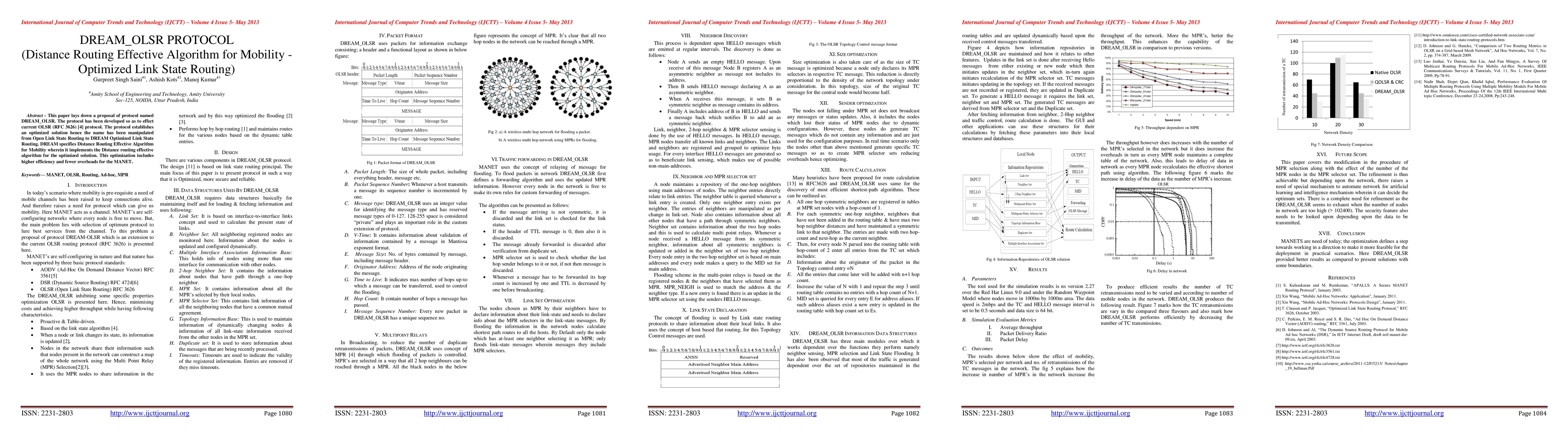 Summary: DREAM_OLSR protocol proposes an optimized version of the OLSR protocol for Mobile Ad Hoc Networks (MANETs), implementing the Distance Routing Effective Algorithm for Mobility to achieve higher efficiency and reduced overheads.