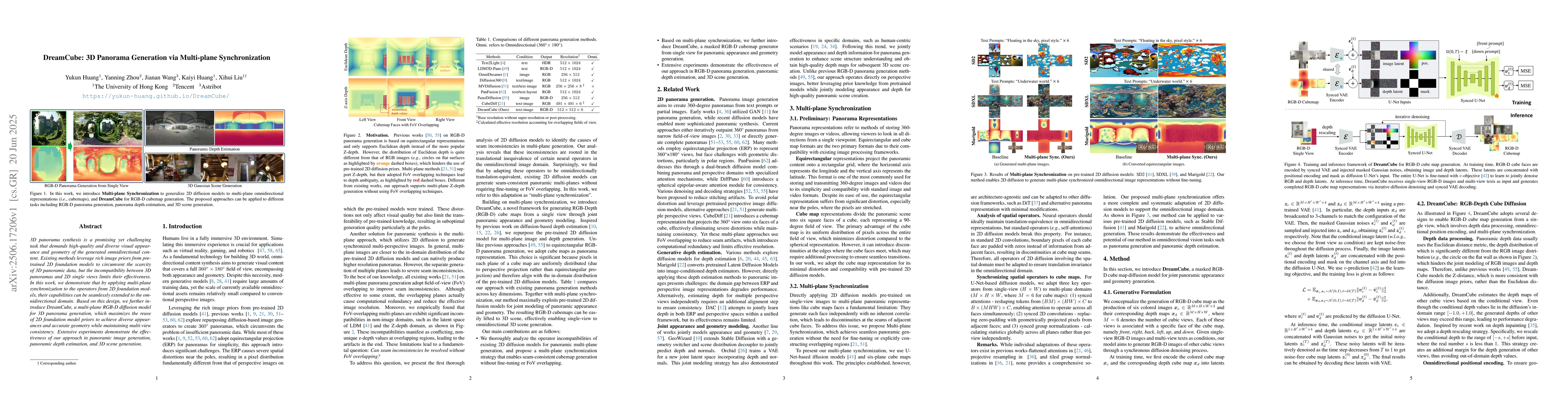 3D panorama synthesis is a promising yet challenging task that demands high-quality and diverse visual appearance and geometry of the generated omnidirectional content. Existing methods leverage rich image priors from pre-trained 2D foundation models to circumvent the scarcity of 3D panoramic data, but the incompatibility between 3D panoramas and 2D single views limits their effectiveness. In this work, we demonstrate that by applying multi-plane synchronization to the operators from 2D foundation models, their capabilities can be seamlessly extended to the omnidirectional domain. Based on this design, we further introduce DreamCube, a multi-plane RGB-D diffusion model for 3D panorama generation, which maximizes the reuse of 2D foundation model priors to achieve diverse appearances and accurate geometry while maintaining multi-view consistency. Extensive experiments demonstrate the effectiveness of our approach in panoramic image generation, panoramic depth estimation, and 3D scene generation.