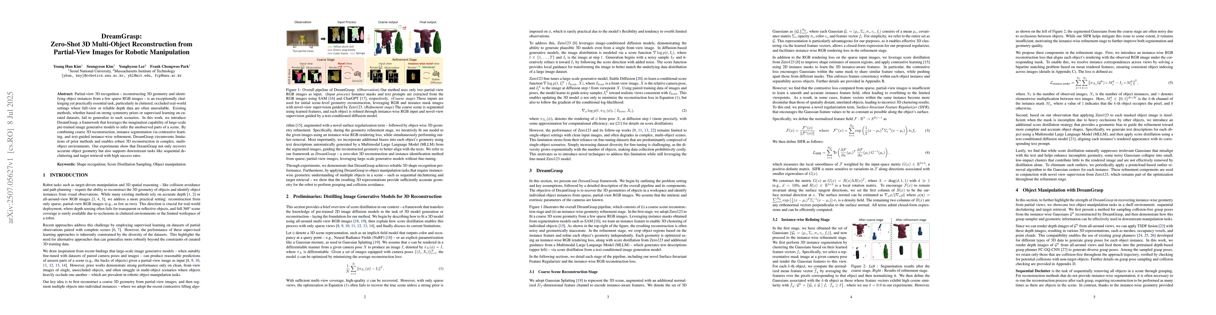 Partial-view 3D recognition -- reconstructing 3D geometry and identifying object instances from a few sparse RGB images -- is an exceptionally challenging yet practically essential task, particularly in cluttered, occluded real-world settings where full-view or reliable depth data are often unavailable. Existing methods, whether based on strong symmetry priors or supervised learning on curated datasets, fail to generalize to such scenarios. In this work, we introduce DreamGrasp, a framework that leverages the imagination capability of large-scale pre-trained image generative models to infer the unobserved parts of a scene. By combining coarse 3D reconstruction, instance segmentation via contrastive learning, and text-guided instance-wise refinement, DreamGrasp circumvents limitations of prior methods and enables robust 3D reconstruction in complex, multi-object environments. Our experiments show that DreamGrasp not only recovers accurate object geometry but also supports downstream tasks like sequential decluttering and target retrieval with high success rates.