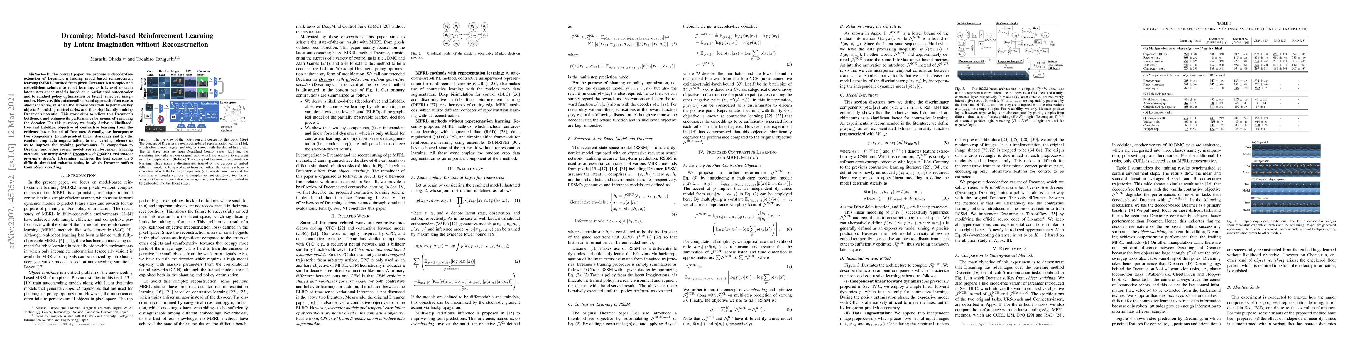 This paper proposes a decoder-free version of Dreamer, a model-based reinforcement learning method, to address object vanishing issues. The new method, Dreaming, achieves superior performance on simulated robotics tasks by incorporating contrastive learning and data augmentation.