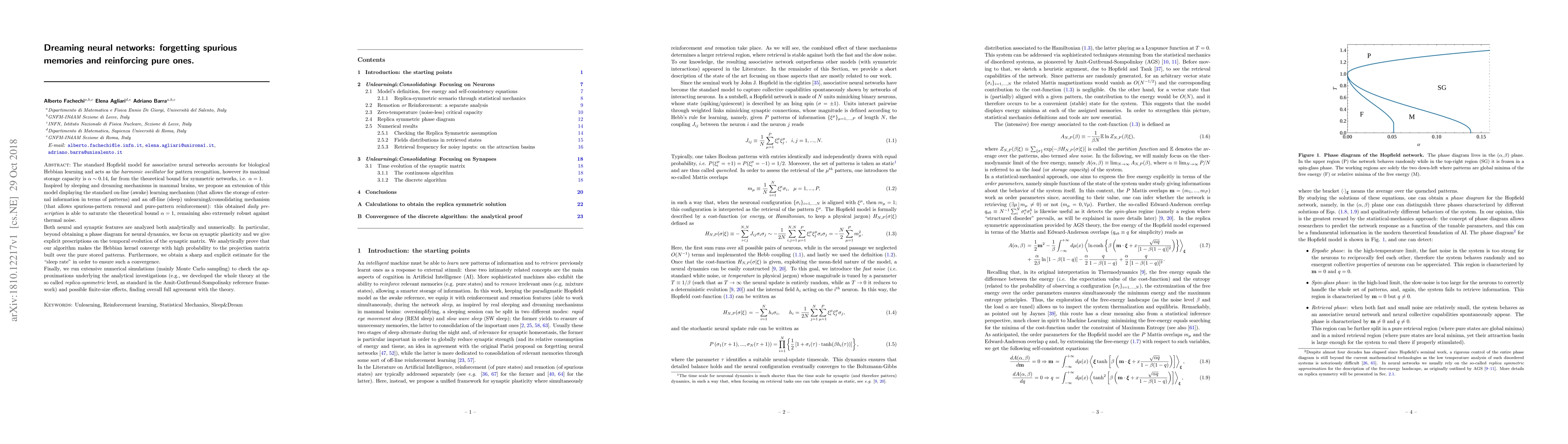 This paper proposes an extended Hopfield model for associative neural networks that incorporates an off-line unlearning and consolidating mechanism inspired by sleep and dreaming, achieving a storage capacity of $\alpha = 1$ and robustness against noise. The model analytically and numerically demonstrates the convergence of the Hebbian kernel to pure stored patterns, with explicit prescriptions for synaptic evolution.