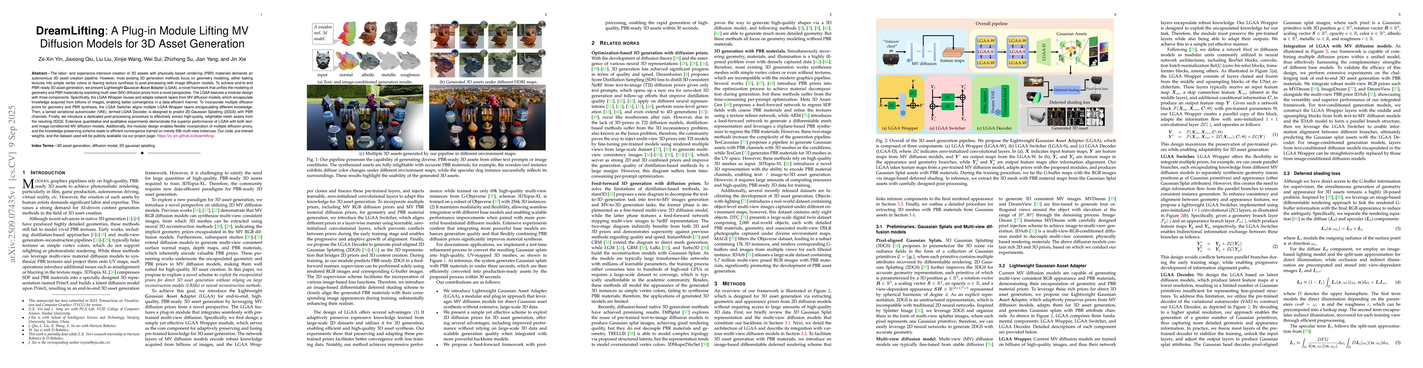 The labor- and experience-intensive creation of 3D assets with physically based rendering (PBR) materials demands an autonomous 3D asset creation pipeline. However, most existing 3D generation methods focus on geometry modeling, either baking textures into simple vertex colors or leaving texture synthesis to post-processing with image diffusion models. To achieve end-to-end PBR-ready 3D asset generation, we present Lightweight Gaussian Asset Adapter (LGAA), a novel framework that unifies the modeling of geometry and PBR materials by exploiting multi-view (MV) diffusion priors from a novel perspective. The LGAA features a modular design with three components. Specifically, the LGAA Wrapper reuses and adapts network layers from MV diffusion models, which encapsulate knowledge acquired from billions of images, enabling better convergence in a data-efficient manner. To incorporate multiple diffusion priors for geometry and PBR synthesis, the LGAA Switcher aligns multiple LGAA Wrapper layers encapsulating different knowledge. Then, a tamed variational autoencoder (VAE), termed LGAA Decoder, is designed to predict 2D Gaussian Splatting (2DGS) with PBR channels. Finally, we introduce a dedicated post-processing procedure to effectively extract high-quality, relightable mesh assets from the resulting 2DGS. Extensive quantitative and qualitative experiments demonstrate the superior performance of LGAA with both text-and image-conditioned MV diffusion models. Additionally, the modular design enables flexible incorporation of multiple diffusion priors, and the knowledge-preserving scheme leads to efficient convergence trained on merely 69k multi-view instances. Our code, pre-trained weights, and the dataset used will be publicly available via our project page: https://zx-yin.github.io/dreamlifting/.