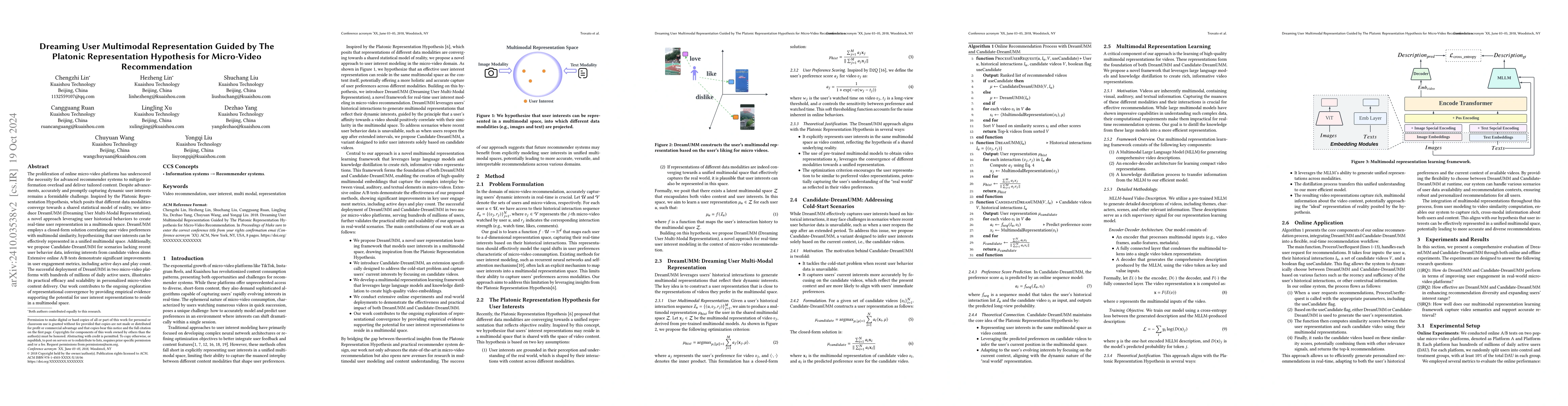 DreamUMM, a novel approach leveraging user historical behaviors, creates real-time user representation in a multimodal space to enhance micro-video recommendation systems, showing significant improvements in user engagement metrics through extensive online A/B tests. The approach also includes Candidate-DreamUMM for inferring interests from candidate videos alone, demonstrating practical efficacy and scalability.