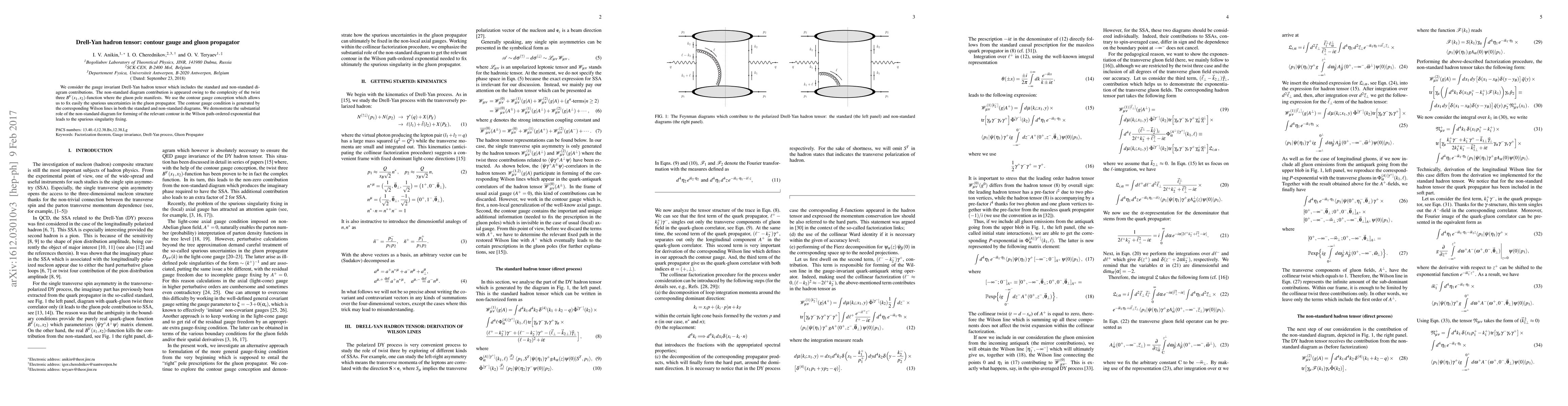 We consider the gauge invariant Drell-Yan hadron tensor which includes the standard and non-standard diagram contributions. The non-standard diagram contribution is appeared owing to the complexity of the twist three $B^V(x_1,x_2)$-function where the gluon pole manifests. We use the contour gauge conception which allows us to fix easily the spurious uncertainties in the gluon propagator. The contour gauge condition is generated by the corresponding Wilson lines in both the standard and non-standard diagrams. We demonstrate the substantial role of the non-standard diagram for forming of the relevant contour in the Wilson path-ordered exponential that leads to the spurious singularity fixing.