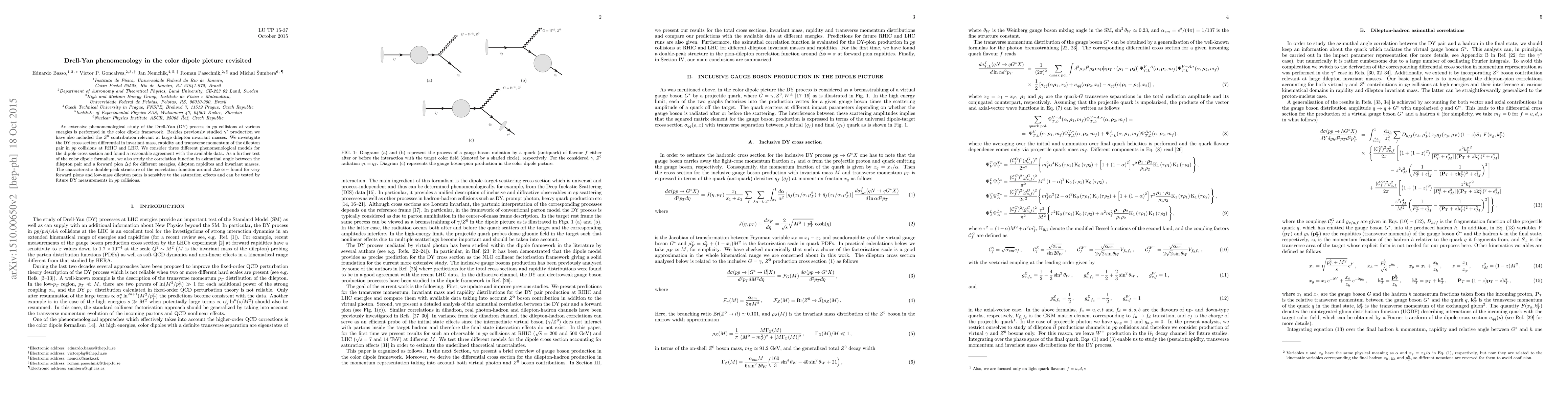 This paper revisits the Drell-Yan process in proton-proton collisions using the color dipole framework, including both $\gamma^*$ and $Z^0$ contributions. It finds reasonable agreement with data from RHIC and LHC, and highlights a double-peak structure in the correlation function between dilepton pairs and forward pions, sensitive to saturation effects.