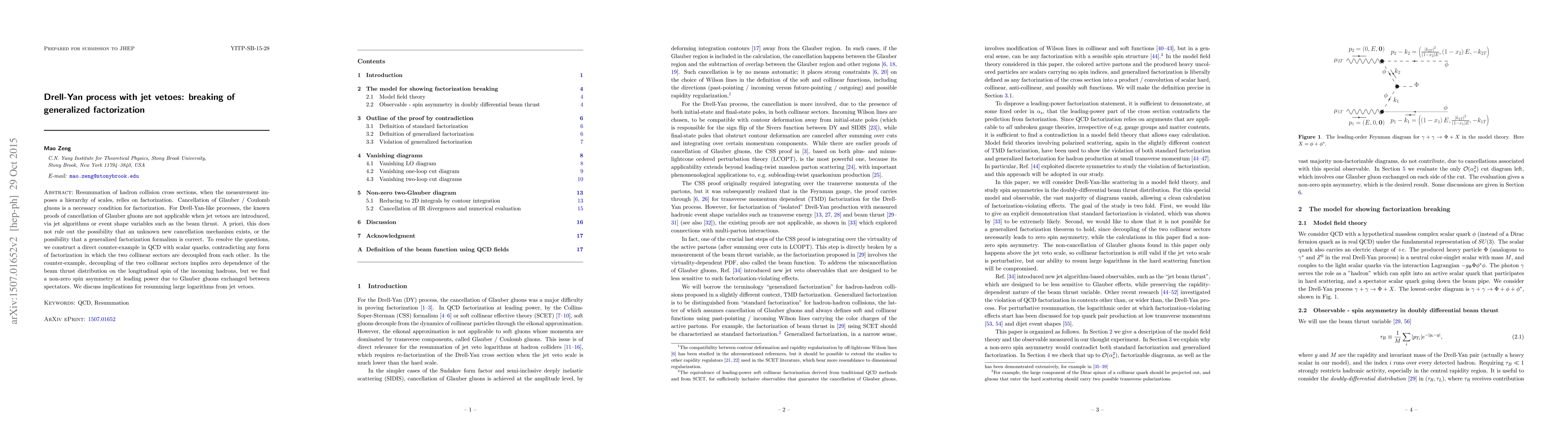 Resummation of hadron collision cross sections, when the measurement imposes a hierarchy of scales, relies on factorization. Cancellation of Glauber / Coulomb gluons is a necessary condition for factorization. For Drell-Yan-like processes, the known proofs of cancellation of Glauber gluons are not applicable when jet vetoes are introduced, via jet algorithms or event shape variables such as the beam thrust. A priori, this does not rule out the possibility that an unknown new cancellation mechanism exists, or the possibility that a generalized factorization formalism is correct. To resolve the questions, we construct a direct counter-example in QCD with scalar quarks, contradicting any form of factorization in which the two collinear sectors are decoupled from each other. In the counter-example, decoupling of the two collinear sectors implies zero dependence of the beam thrust distribution on the longitudinal spin of the incoming hadrons, but we find a non-zero spin asymmetry at leading power due to Glauber gluons exchanged between spectators. We discuss implications for resumming large logarithms from jet vetoes.