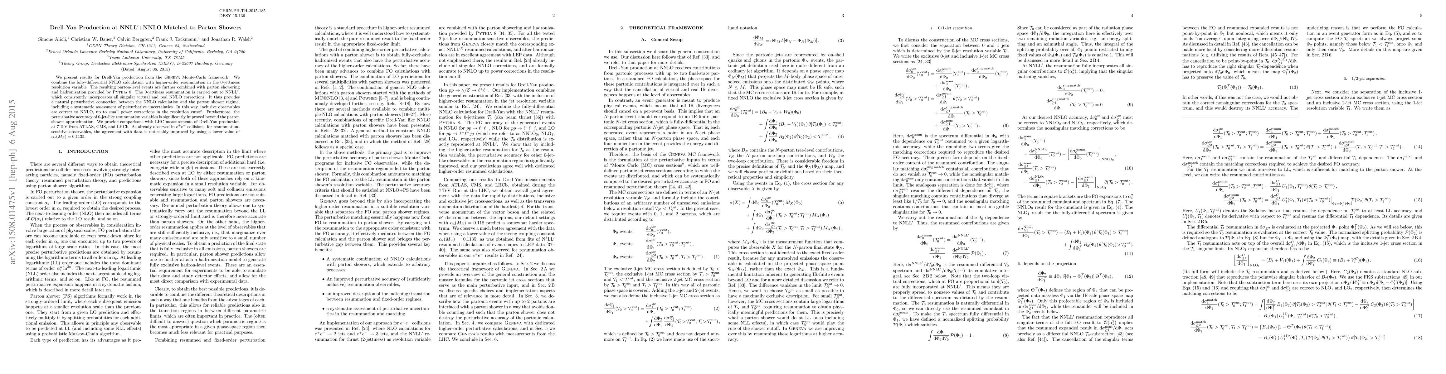 This paper presents a refined Drell-Yan production model combining NNLO calculations with NNLL' resummation and parton showering in the GENEVA framework, achieving improved accuracy and agreement with LHC data, particularly with a lower $\alpha_s(M_Z)$ value. The study also enhances the precision of resummation variables beyond the parton shower approximation.