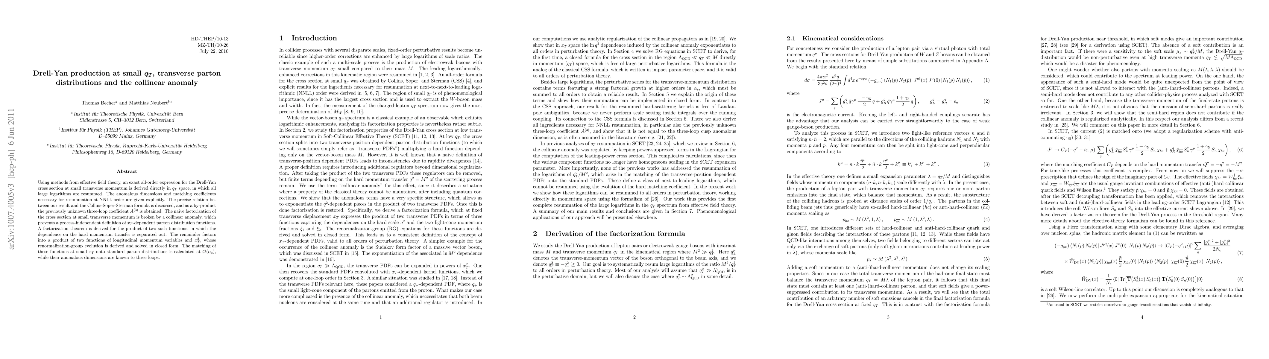 Using methods from effective field theory, an exact all-order expression for the Drell-Yan cross section at small transverse momentum is derived directly in q_T space, in which all large logarithms are resummed. The anomalous dimensions and matching coefficients necessary for resummation at NNLL order are given explicitly. The precise relation between our result and the Collins-Soper-Sterman formula is discussed, and as a by-product the previously unknown three-loop coefficient A^(3) is obtained. The naive factorization of the cross section at small transverse momentum is broken by a collinear anomaly, which prevents a process-independent definition of x_T-dependent parton distribution functions. A factorization theorem is derived for the product of two such functions, in which the dependence on the hard momentum transfer is separated out. The remainder factors into a product of two functions of longitudinal momentum variables and x_T^2, whose renormalization-group evolution is derived and solved in closed form. The matching of these functions at small x_T onto standard parton distributions is calculated at O(alpha_s), while their anomalous dimensions are known to three loops.