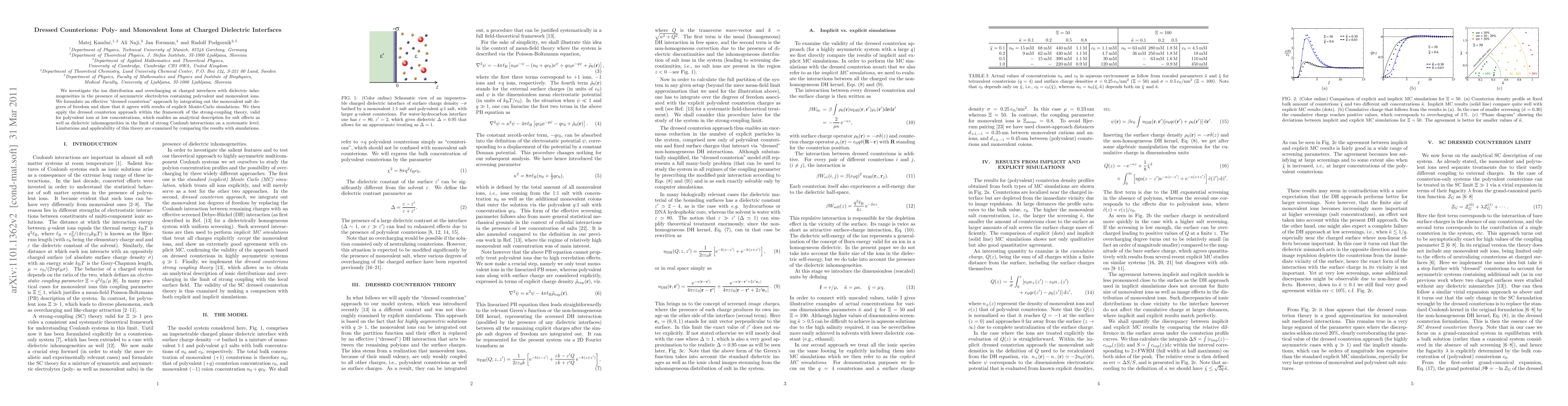 This paper develops a "dressed counterion" approach to study the distribution and overcharging of poly- and monovalent ions at charged dielectric interfaces, showing agreement with Monte-Carlo simulations. The approach, grounded in strong-coupling theory, provides an analytical framework for understanding salt effects and dielectric inhomogeneities under strong Coulomb interactions.