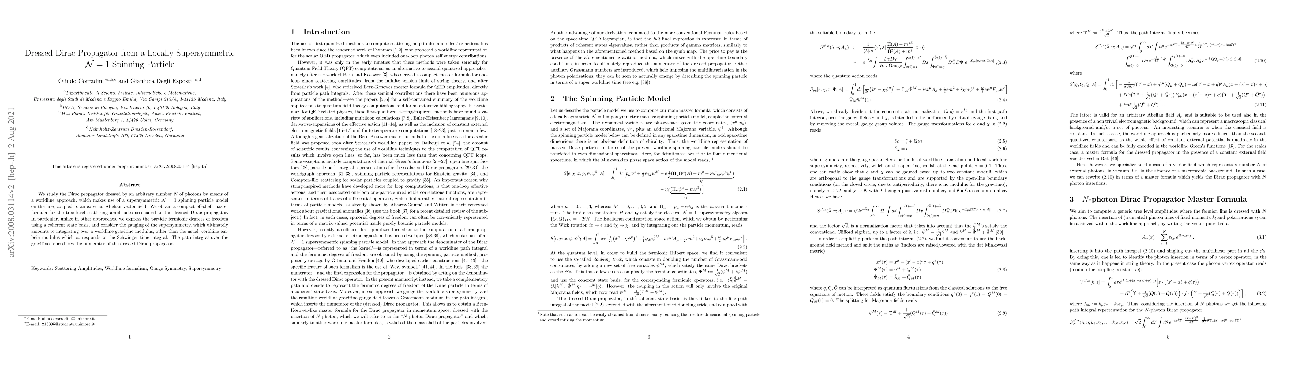 This paper develops a worldline approach using a supersymmetric spinning particle model to derive a compact formula for the dressed Dirac propagator involving an arbitrary number of photons. It uniquely integrates over a worldline gravitino modulus, providing a novel expression for the dressed propagator's numerator.