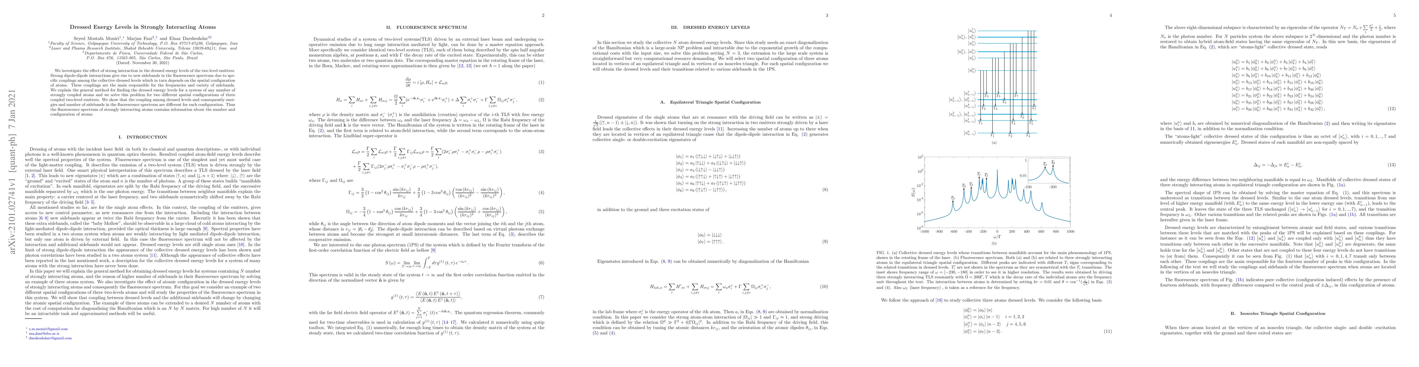 We investigate the effect of strong interaction in the dressed energy levels of the two level emitters. Strong dipole-dipole interactions give rise to new sidebands in the fluorescence spectrum due to specific couplings among the collective dressed levels which in turn depends on the spatial configuration of atoms. These couplings are the main responsible for the frequencies and variety of sidebands. We explain the general method for finding the dressed energy levels for a system of any number of strongly coupled atoms and we solve this problem for two different spatial configurations of three coupled two-level emitters. We show that the coupling among dressed levels and consequently energies and number of sidebands in the fluorescence spectrum are different for each configuration. Thus the fluorescence spectrum of strongly interacting atoms contains information about the number and configuration of atoms.