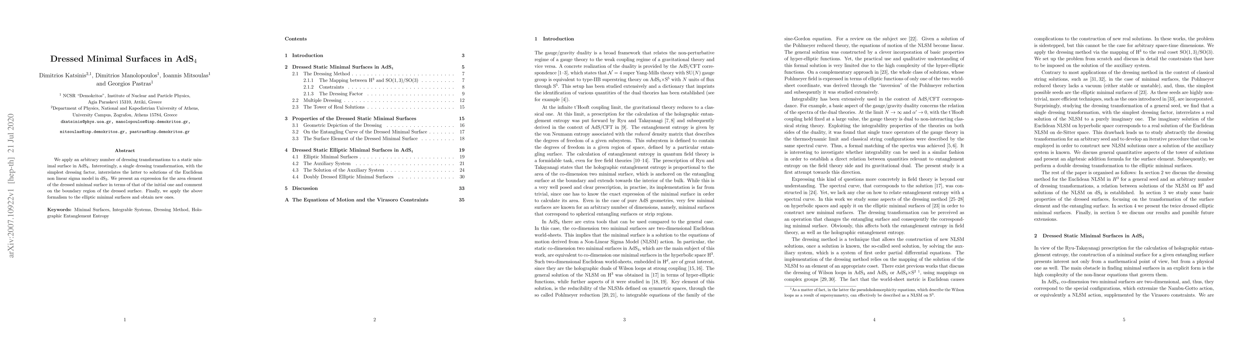 This paper explores the application of dressing transformations to static minimal surfaces in AdS$_4$, revealing how a single transformation relates these surfaces to solutions of the Euclidean nonlinear sigma model in dS(3). It provides an expression for the area of dressed minimal surfaces and discusses their boundary regions, ultimately generating new elliptic minimal surfaces.