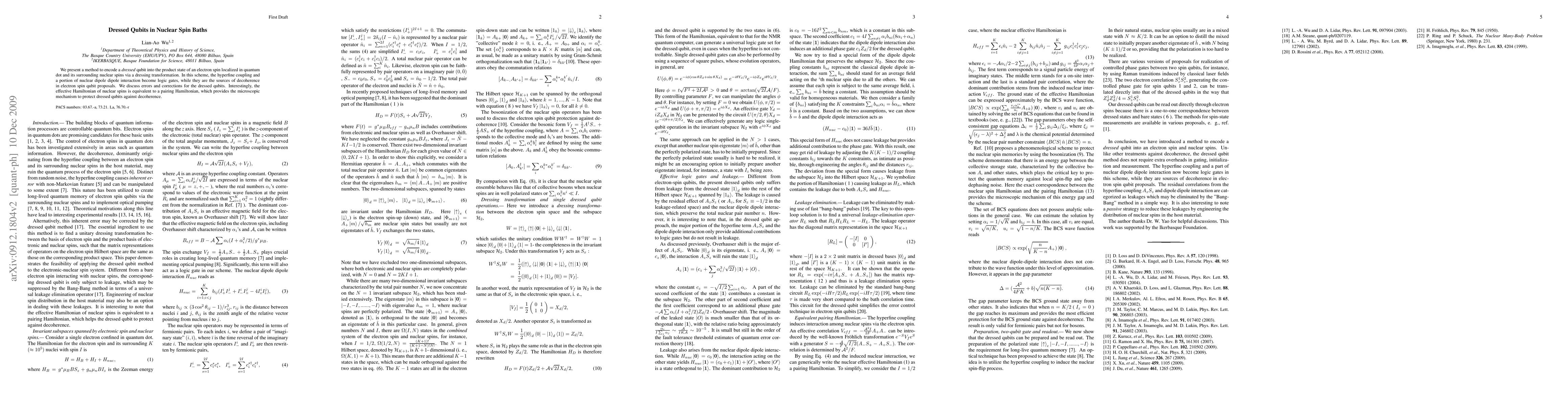 Researchers developed a method to encode qubits in nuclear spin baths using dressing transformations, allowing hyperfine coupling and nuclear dipole interactions to serve as logic gates while mitigating decoherence.