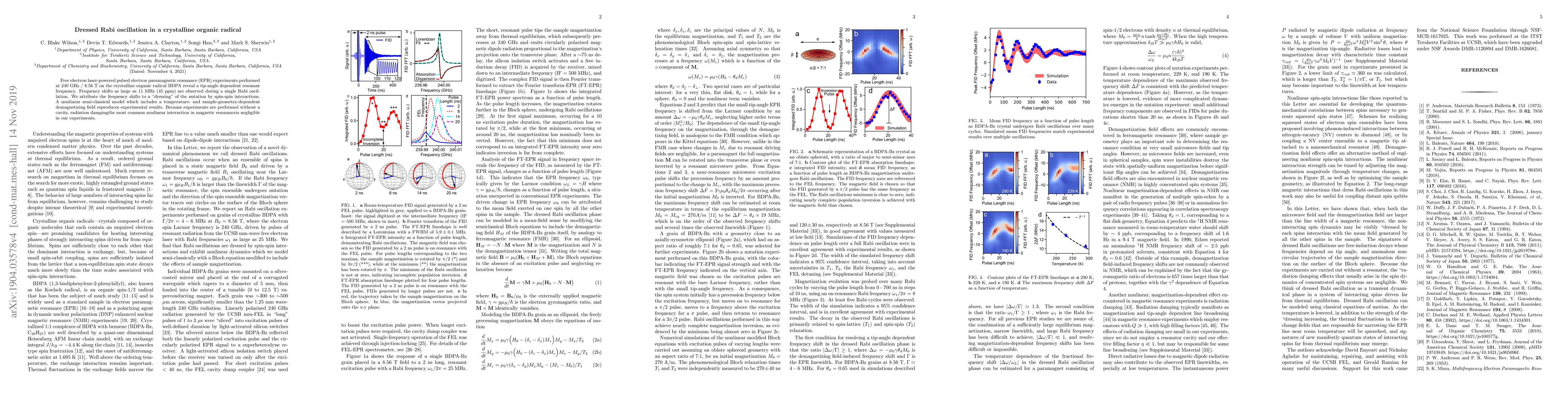 This paper reports on free electron laser-powered EPR experiments revealing significant frequency shifts during Rabi oscillations in a crystalline organic radical, attributed to spin-spin interactions "dressing" the nutation. A nonlinear semi-classical model accurately reproduces the observed effects, highlighting negligible radiation damping in the cavity-free setup.