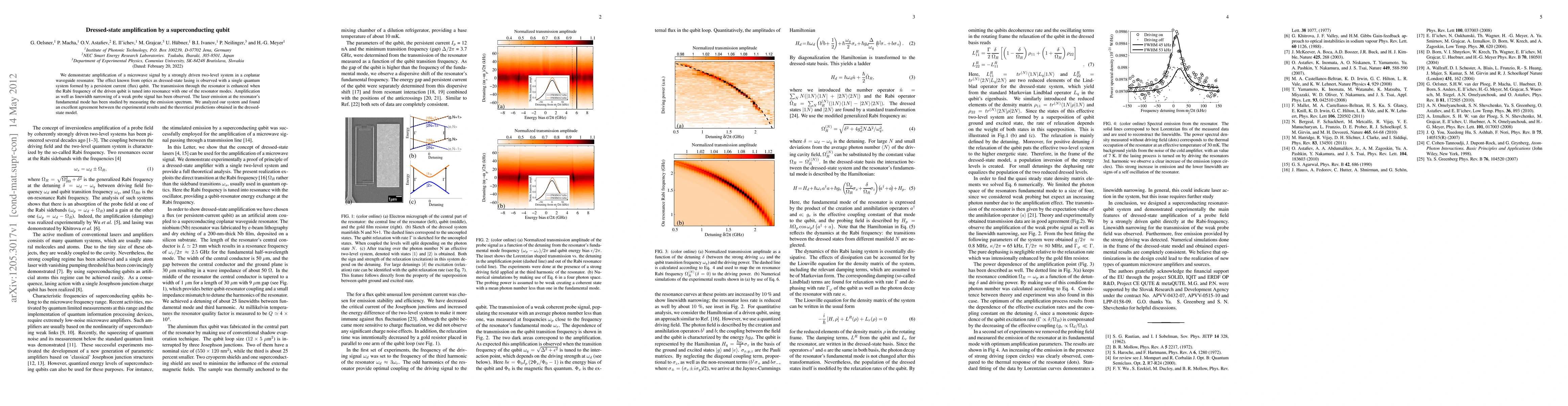 This paper demonstrates microwave signal amplification using a superconducting flux qubit in a coplanar waveguide resonator, observing dressed-state lasing effects. The study shows enhanced transmission and linewidth narrowing of a probe signal when the qubit's Rabi frequency matches the resonator mode, with strong agreement between experimental results and theoretical predictions.