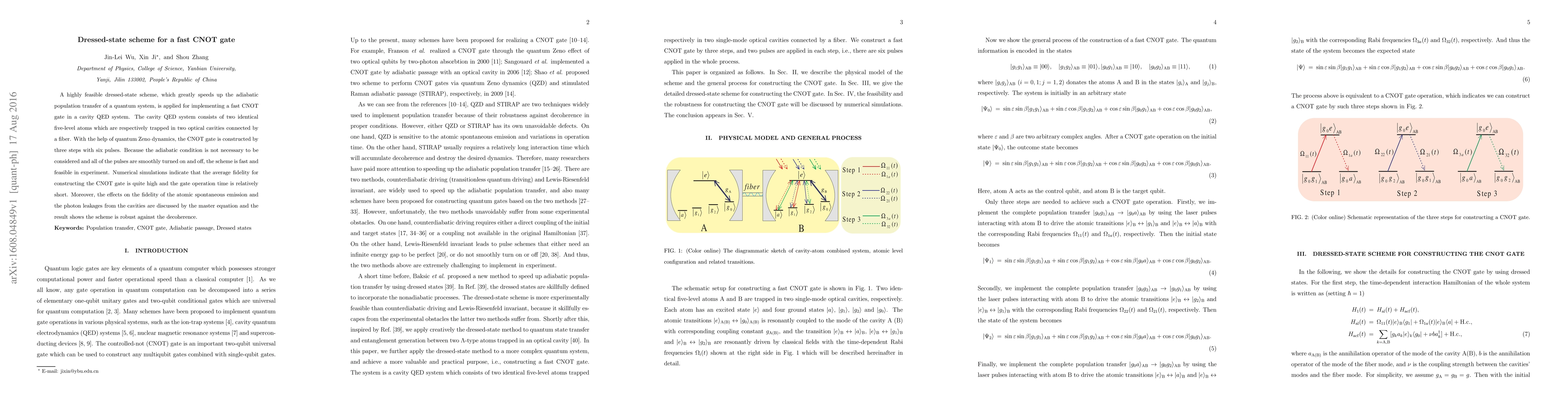 This paper proposes a fast CNOT gate implementation using a dressed-state scheme in a cavity QED system with two five-level atoms. The scheme employs quantum Zeno dynamics and three steps with six pulses, achieving high fidelity and short operation times, while being robust against decoherence.