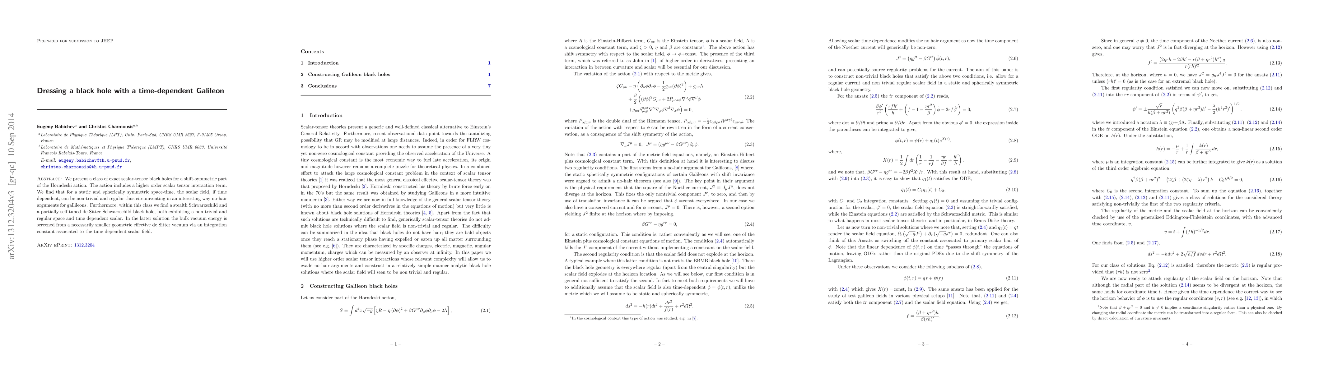We present a class of exact scalar-tensor black holes for a shift-symmetric part of the Horndeski action. The action includes a higher order scalar tensor interaction term. We find that for a static and spherically symmetric space-time, the scalar field, if time dependent, can be non-trivial and regular thus circumventing in an interesting way no-hair arguments for gallileons. Furthermore, within this class we find a stealth Schwarzschild and a partially self-tuned de-Sitter Schwarzschild black hole, both exhibiting a non trivial and regular space and time dependent scalar. In the latter solution the bulk vacuum energy is screened from a necessarily smaller geometric effective de Sitter vacuum via an integration constant associated to the time dependent scalar field.