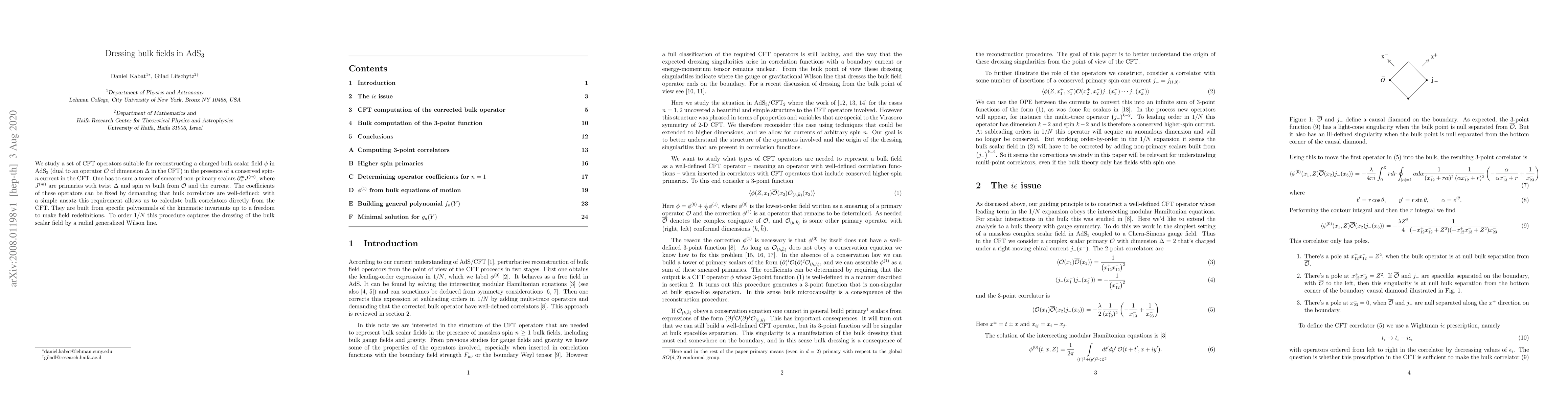 We study a set of CFT operators suitable for reconstructing a charged bulk scalar field $\phi$ in AdS${}_3$ (dual to an operator ${\cal O}$ of dimension $\Delta$ in the CFT) in the presence of a conserved spin-$n$ current in the CFT. One has to sum a tower of smeared non-primary scalars $\partial_{+}^{m} J^{(m)}$, where $J^{(m)}$ are primaries with twist $\Delta$ and spin $m$ built from ${\cal O}$ and the current. The coefficients of these operators can be fixed by demanding that bulk correlators are well-defined: with a simple ansatz this requirement allows us to calculate bulk correlators directly from the CFT. They are built from specific polynomials of the kinematic invariants up to a freedom to make field redefinitions. To order $1/N$ this procedure captures the dressing of the bulk scalar field by a radial generalized Wilson line.