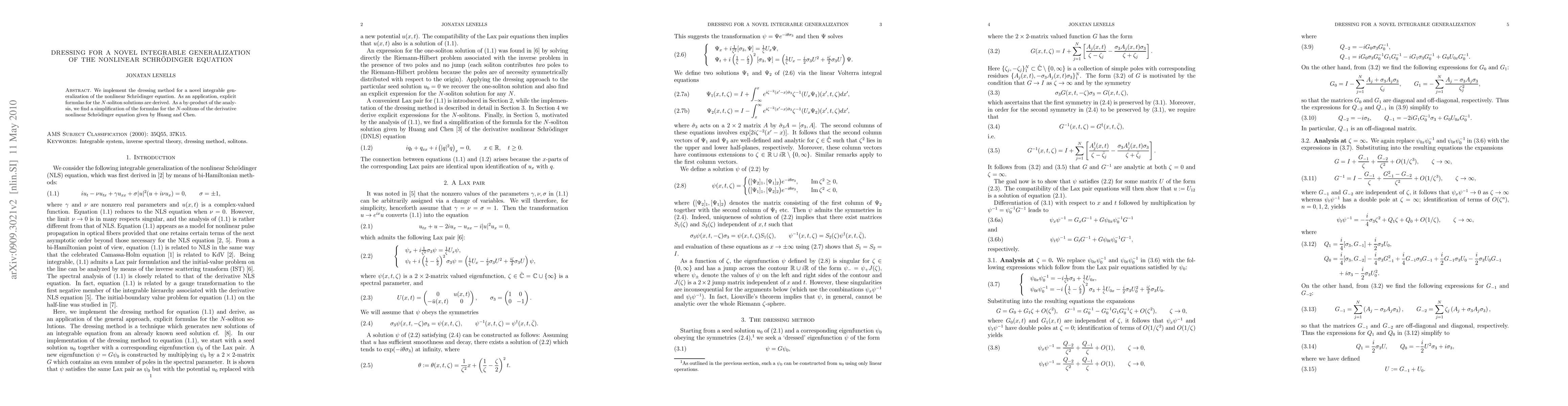 This paper applies the dressing method to a new integrable generalization of the nonlinear Schrödinger equation, deriving explicit formulas for its $N$-soliton solutions and simplifying existing formulas for the derivative nonlinear Schrödinger equation.