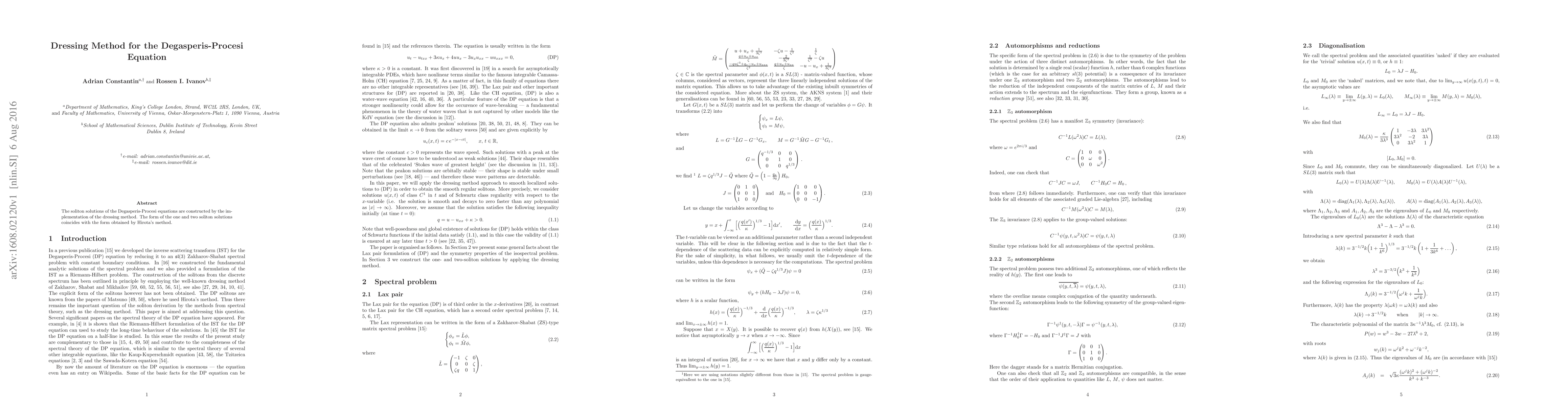 The soliton solutions of the Degasperis-Procesi equations are constructed by the implementation of the dressing method. The form of the one and two soliton solutions coincides with the form obtained by Hirota's method.