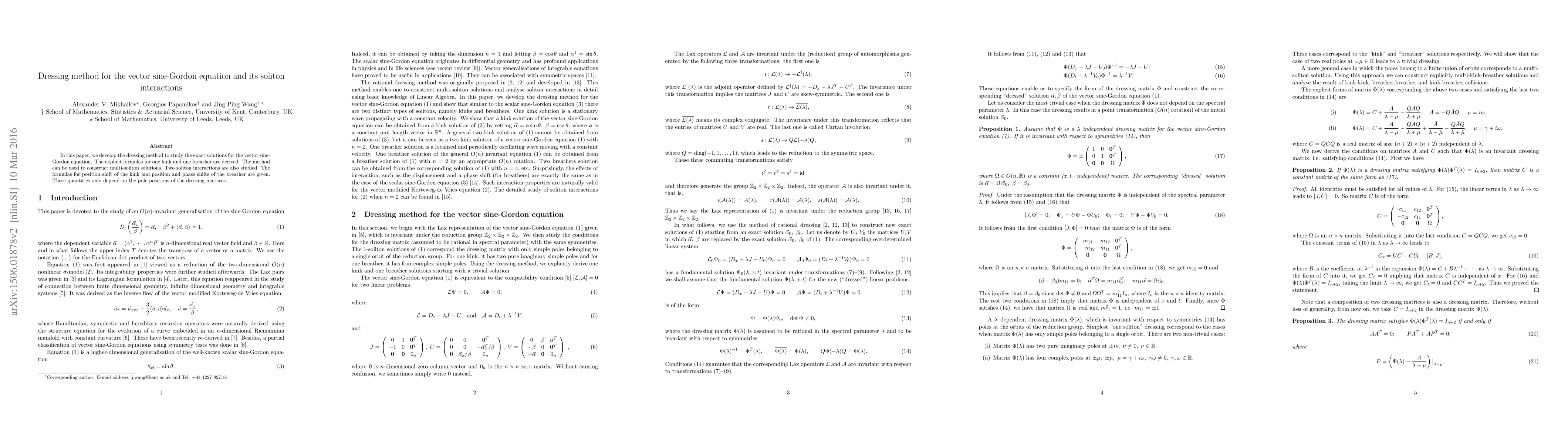 This paper introduces the dressing method to derive exact solutions for the vector sine-Gordon equation, including explicit formulas for one kink and one breather. It also constructs multi-soliton solutions and analyzes two-soliton interactions, providing formulas for shifts dependent on the dressing matrices' pole positions.