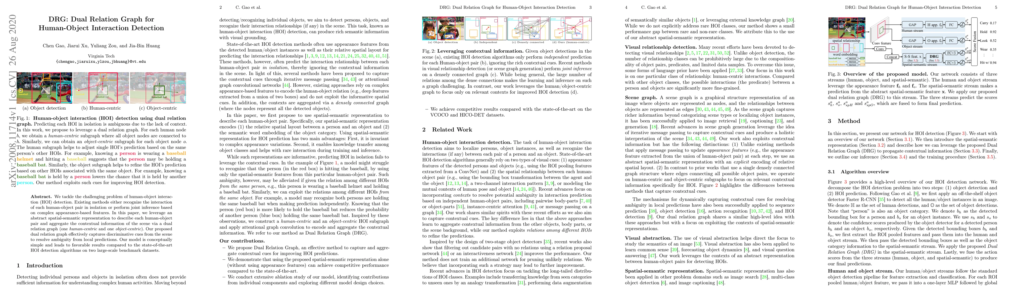 This paper proposes a Dual Relation Graph (DRG) for human-object interaction detection, utilizing spatial-semantic representations and dual graphs to capture contextual information and resolve ambiguities. The model achieves state-of-the-art results on benchmark datasets.