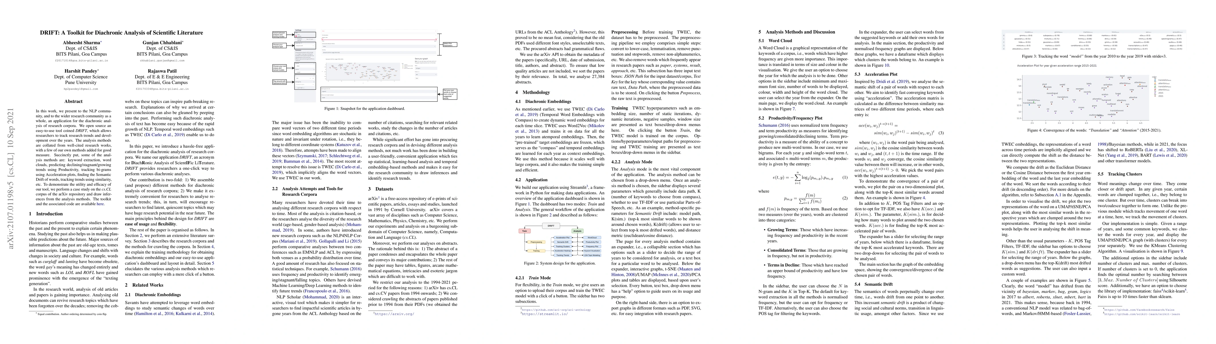 DRIFT is an open-source toolkit for diachronic analysis of scientific literature, enabling researchers to track trends and developments over time using methods like keyword extraction, word clouds, and semantic drift analysis. The tool was demonstrated on the cs.CL corpus from arXiv.