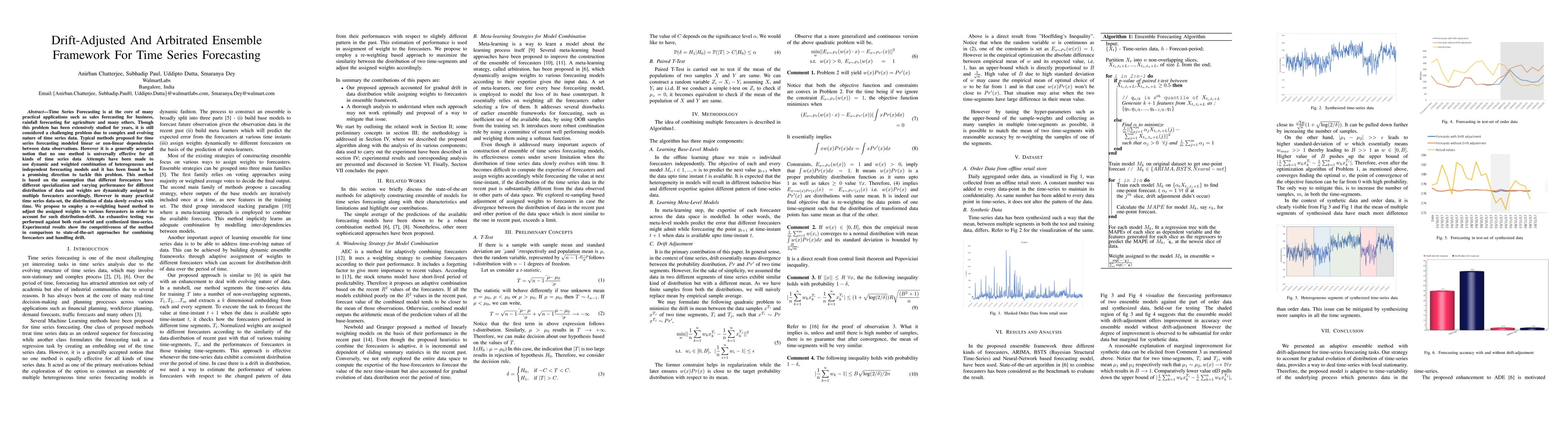 This paper proposes a drift-adjusted and arbitrated ensemble framework for time series forecasting, combining multiple forecasting models to dynamically adjust weights based on evolving data distribution. Experimental results demonstrate its competitiveness against state-of-the-art methods.